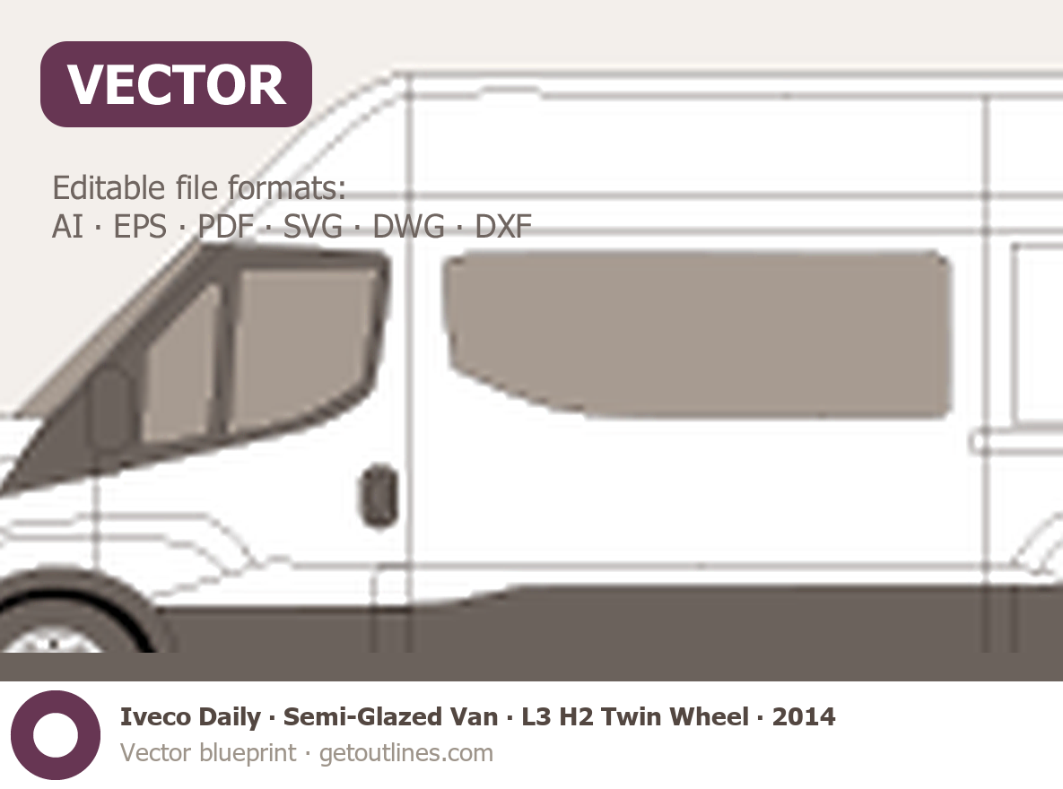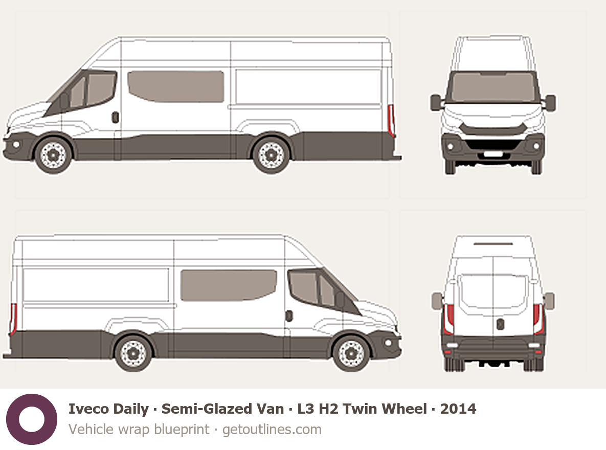This 2014 Iveco Daily Semi-Glazed Van L3 H2 Twin Wheel Van blueprint helps designers, wrap studios, and 3D artists simplify their workflow and save valuable time for creative work instead of routine tasks.