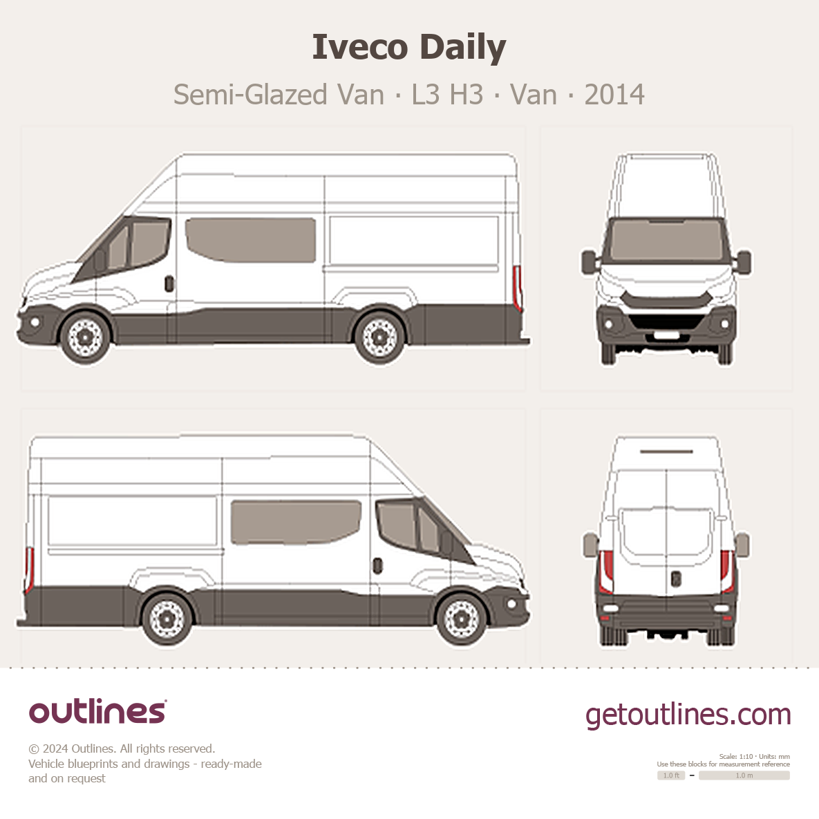 This 2014 Iveco Daily Semi-Glazed Van L3 H3 Van blueprint helps designers, wrap studios, and 3D artists simplify their workflow and save valuable time for creative work instead of routine tasks.