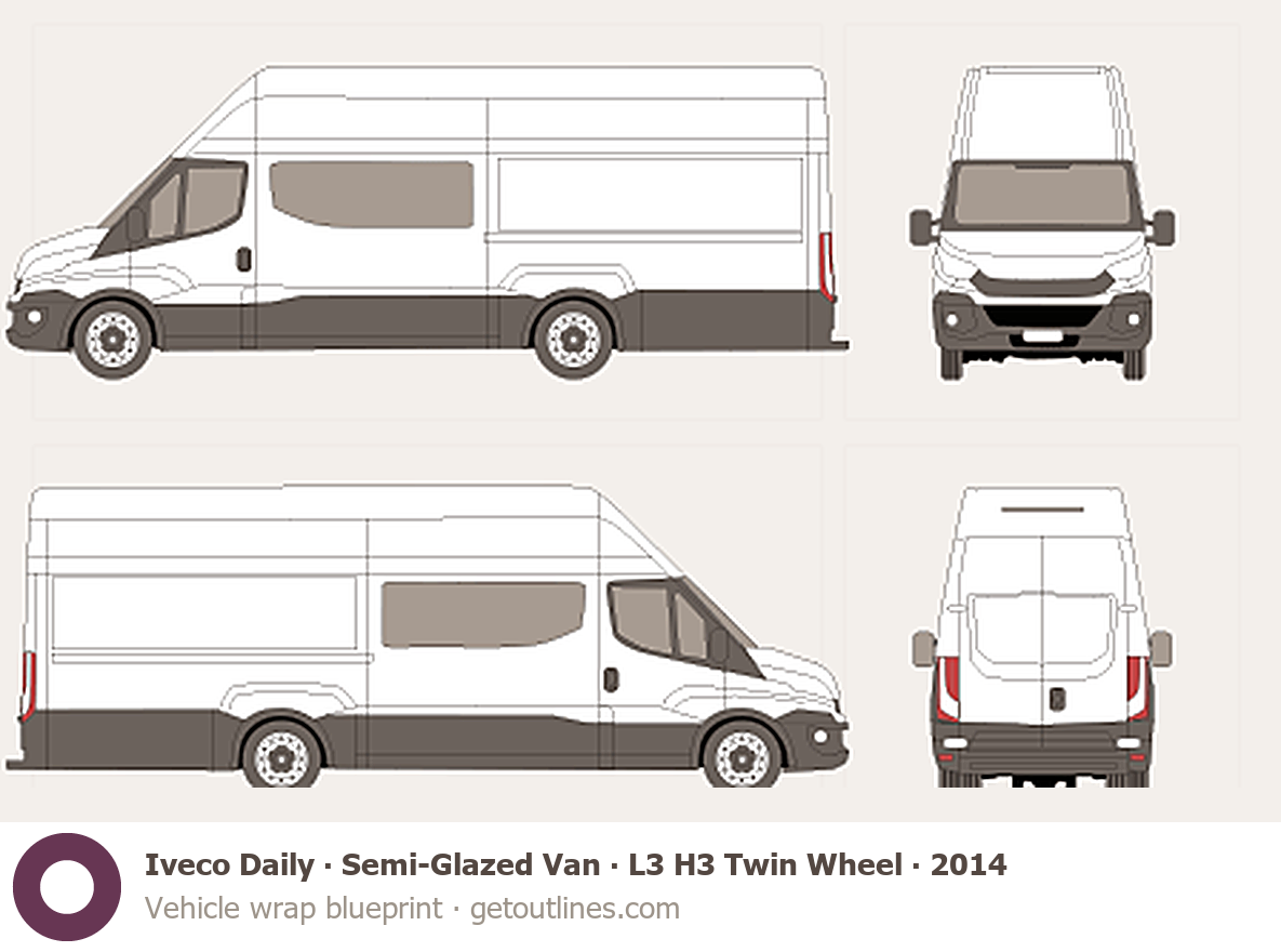 This 2014 Iveco Daily Semi-Glazed Van L3 H3 Twin Wheel Van blueprint helps designers, wrap studios, and 3D artists simplify their workflow and save valuable time for creative work instead of routine tasks.