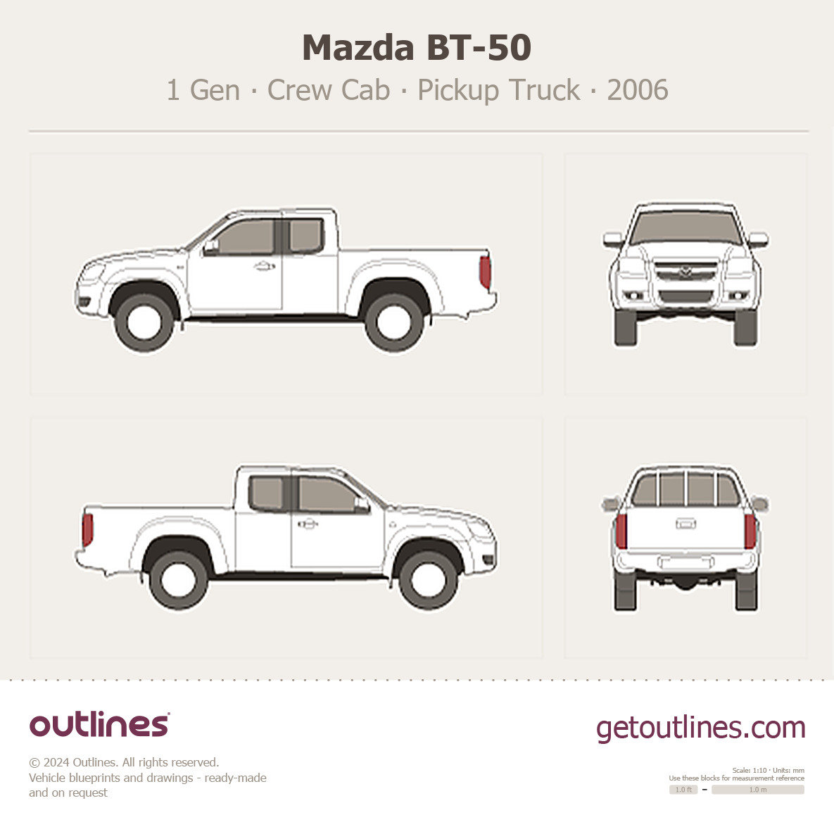 This 2006 Mazda BT-50 1 Gen Crew Cab Pickup Truck blueprint helps designers, wrap studios, and 3D artists simplify their workflow and save valuable time for creative work instead of routine tasks.