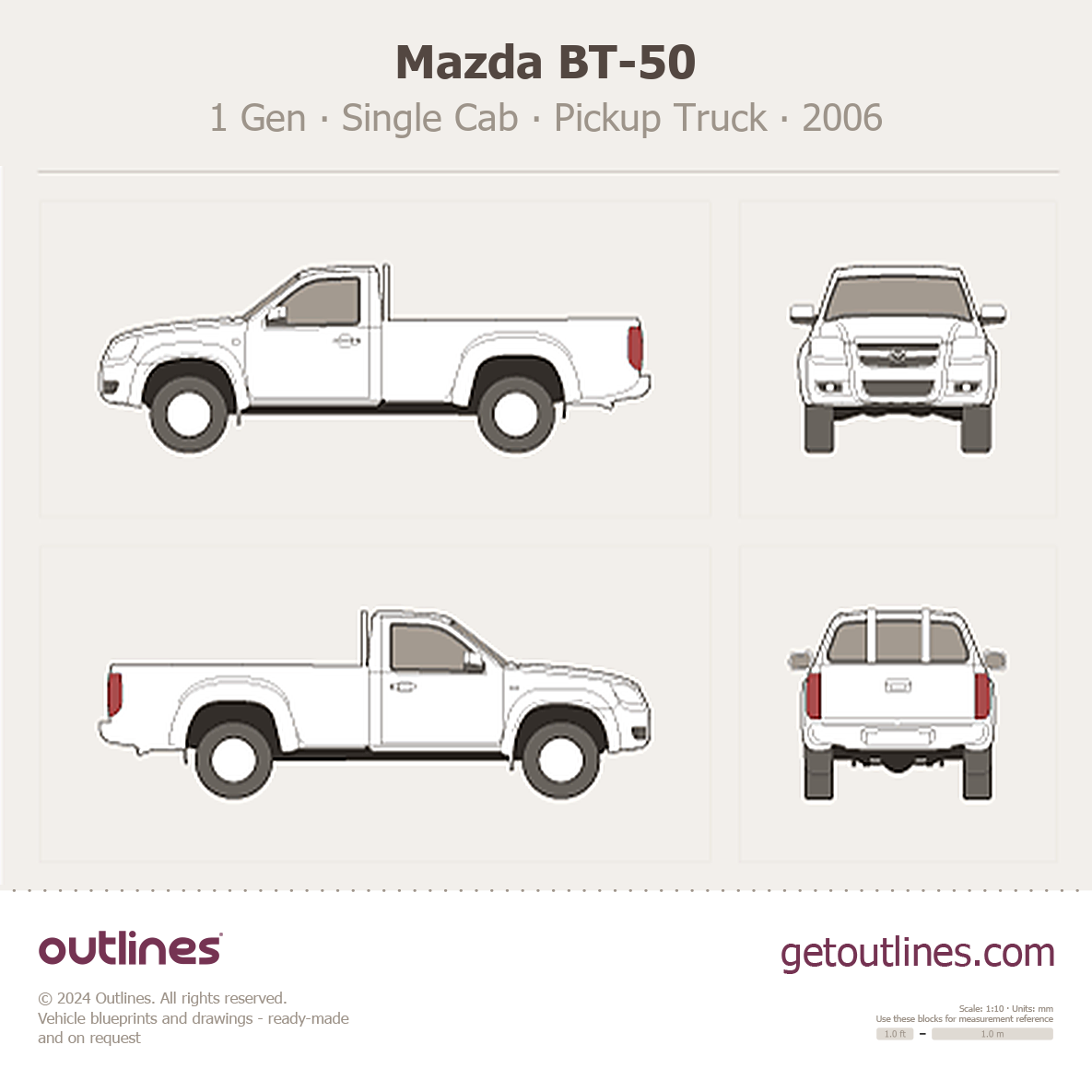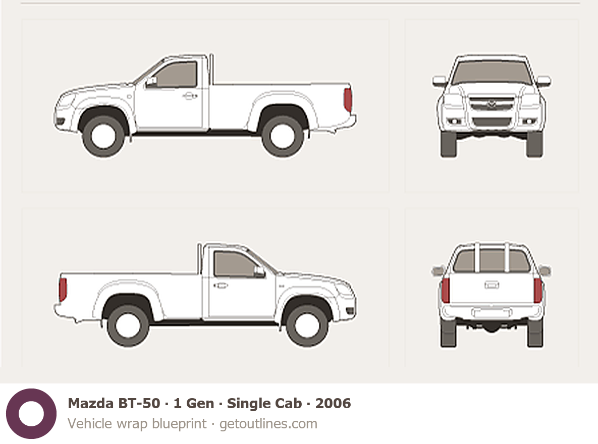 This 2006 Mazda BT-50 1 Gen Single Cab Pickup Truck blueprint helps designers, wrap studios, and 3D artists simplify their workflow and save valuable time for creative work instead of routine tasks.