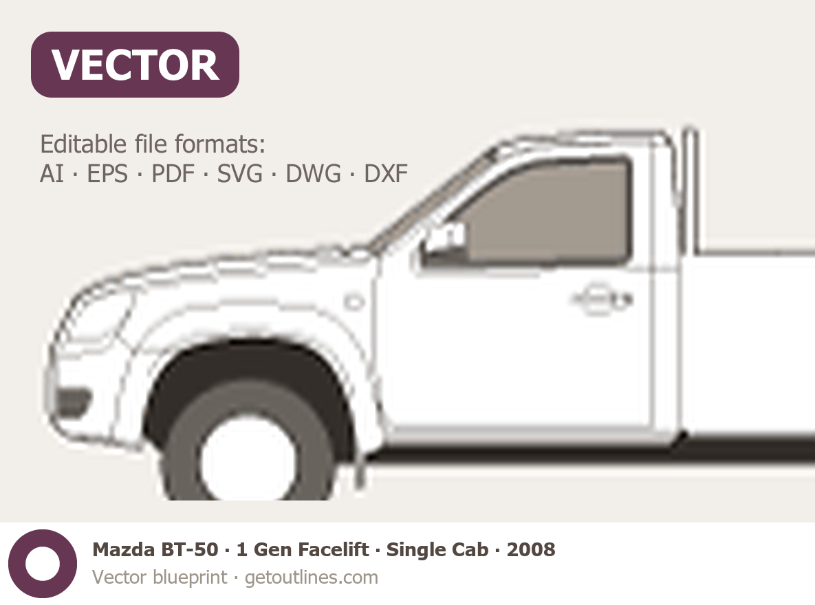 This 2008 Mazda BT-50 1 Gen Facelift Single Cab Pickup Truck blueprint helps designers, wrap studios, and 3D artists simplify their workflow and save valuable time for creative work instead of routine tasks.