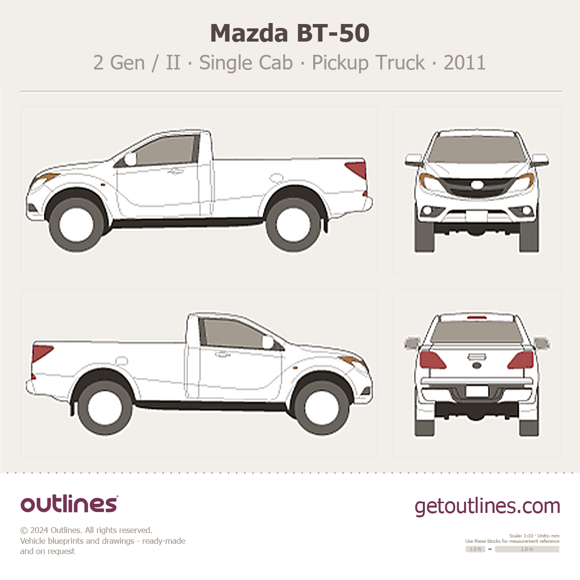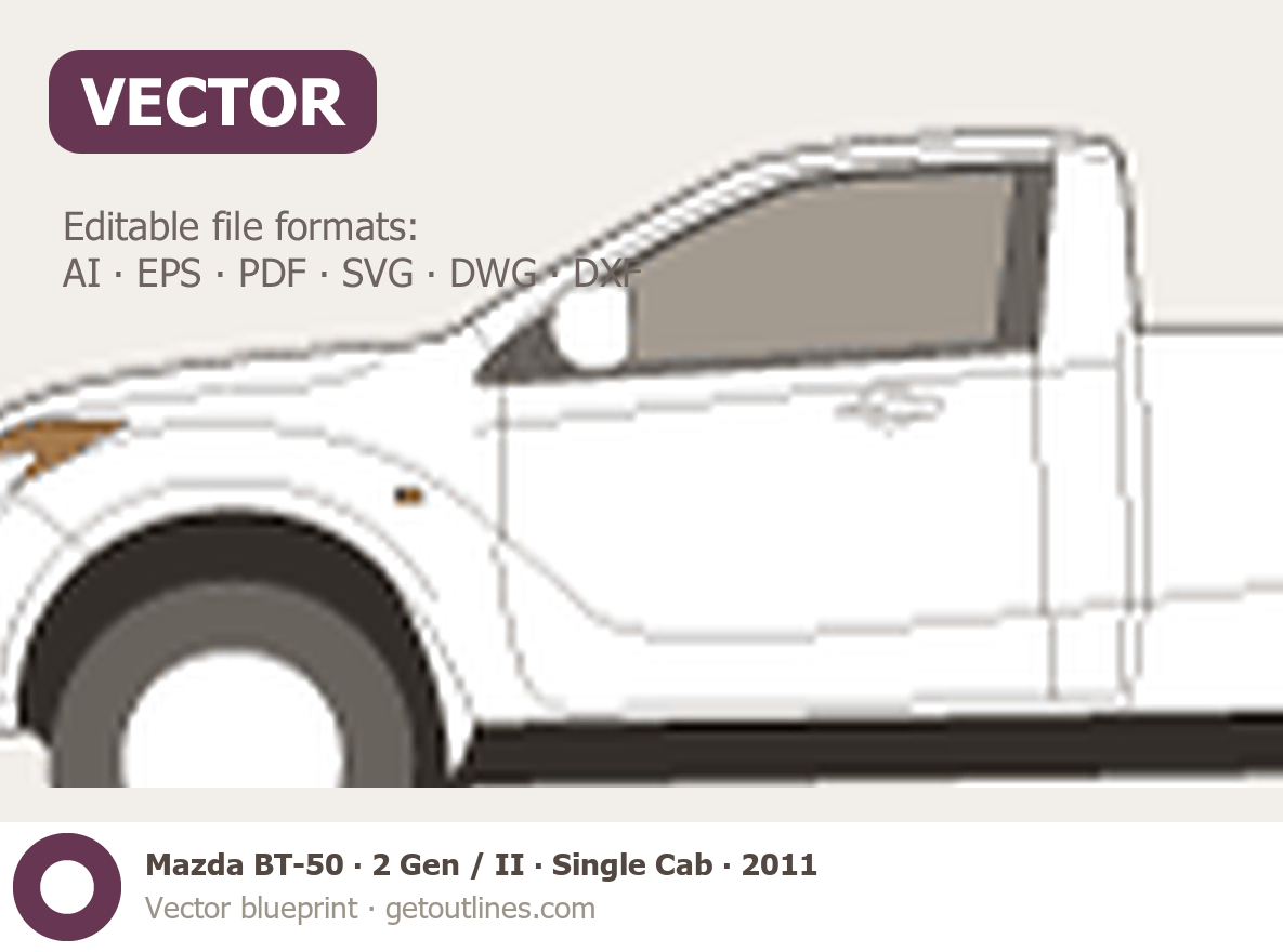 This 2011 Mazda BT-50 2 Gen / II Single Cab Pickup Truck blueprint helps designers, wrap studios, and 3D artists simplify their workflow and save valuable time for creative work instead of routine tasks.