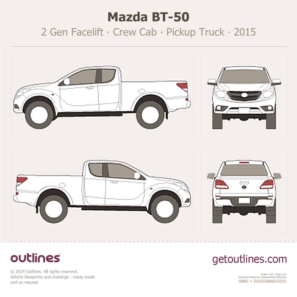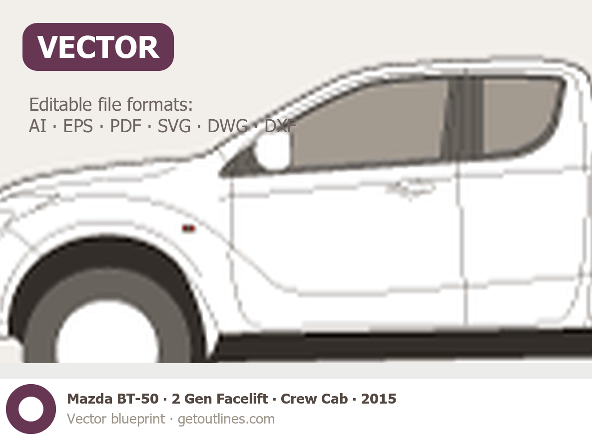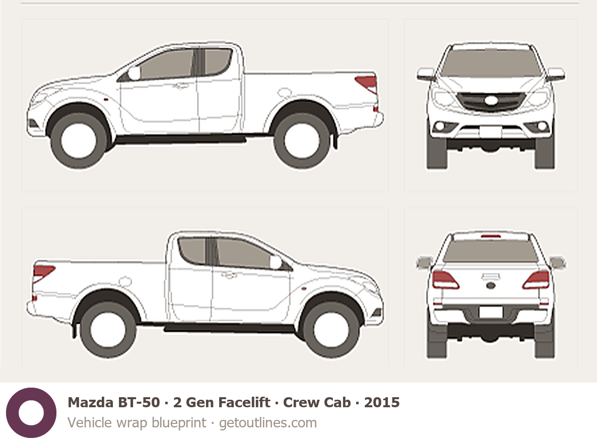 This 2015 Mazda BT-50 2 Gen Facelift Crew Cab Pickup Truck blueprint helps designers, wrap studios, and 3D artists simplify their workflow and save valuable time for creative work instead of routine tasks.