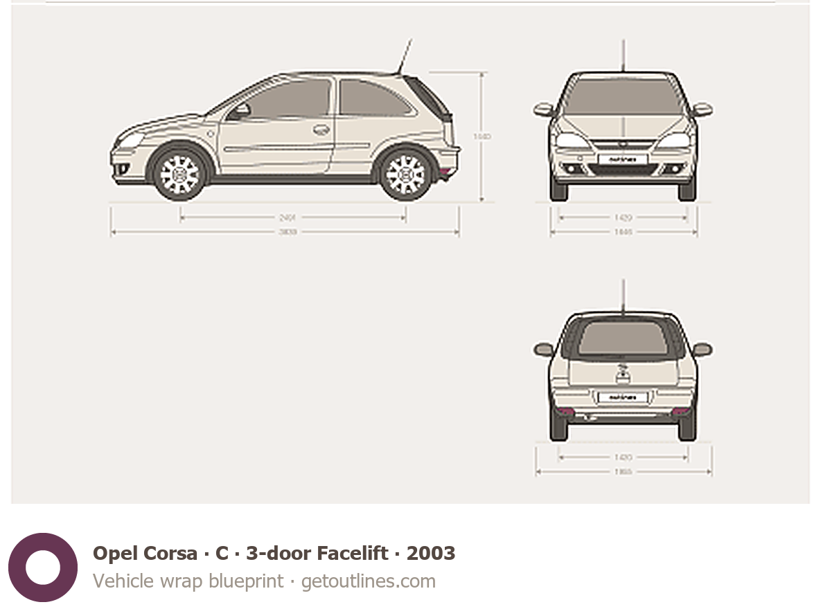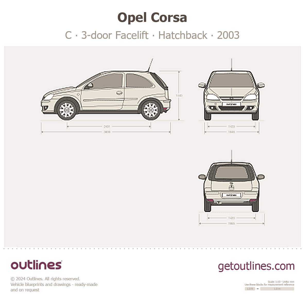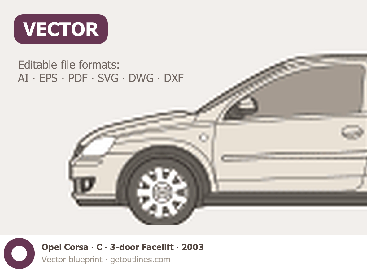 Buy this Opel Corsa C blueprint and line drawing in high-quality editable vector file formats. Best for 3D and car wrap design.