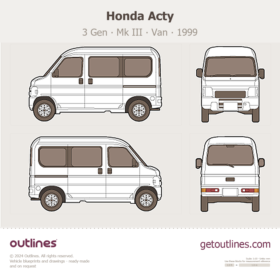 This is a blueprint of the Acty, produced by carmaker Honda in 1999 - 2018. It features a Van body design and is classified as a Commercial vehicle.