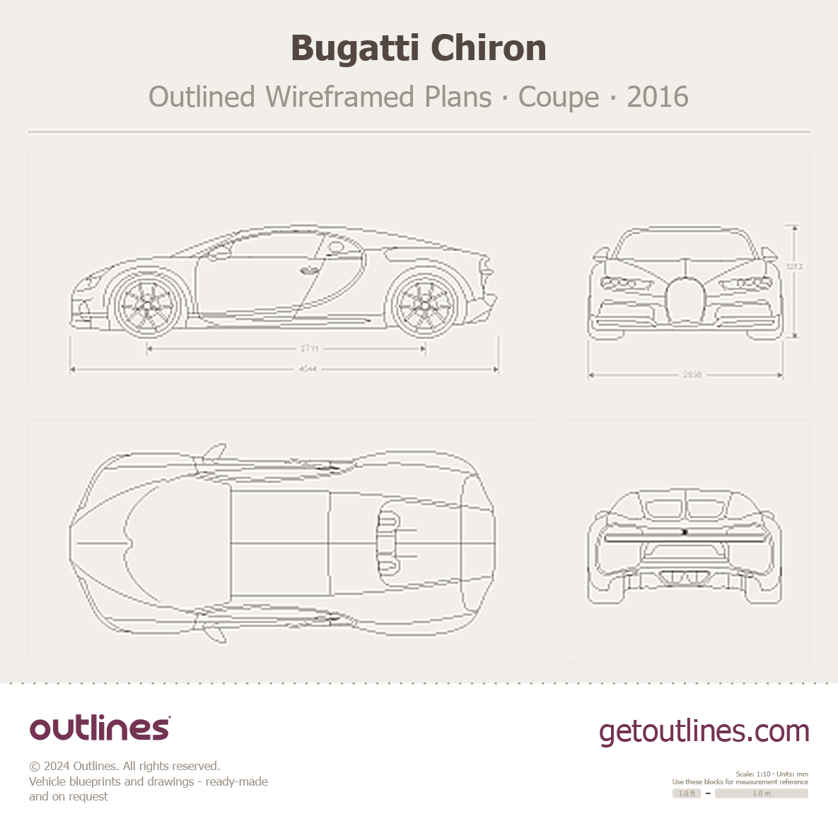 This is a blueprint of the Chiron, produced by carmaker Bugatti in 2016 - Present (2025, 2026). It features a Coupe body design and is classified as a Supercar vehicle.