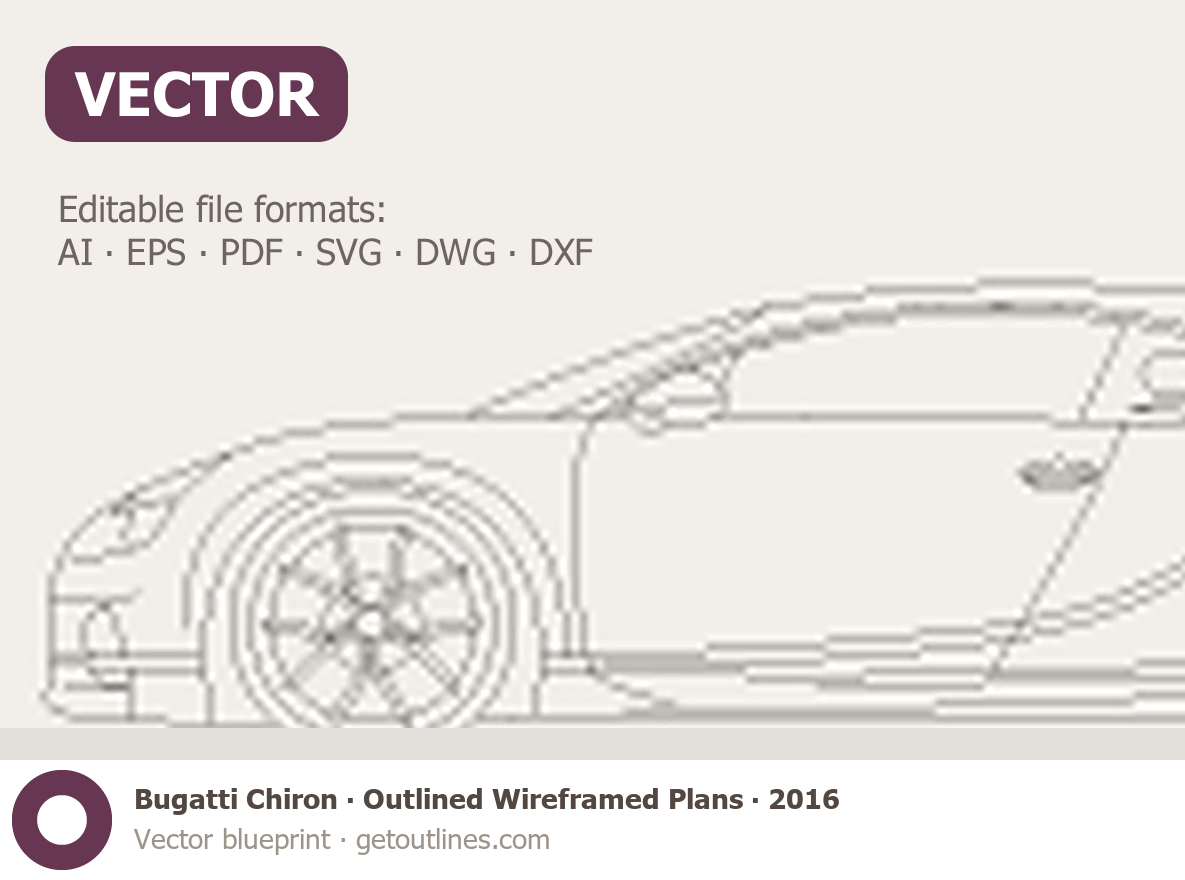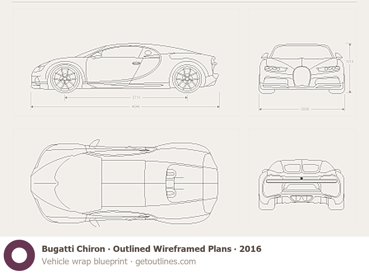 This 2016 Bugatti Chiron Outlined Wireframed Plans Coupe blueprint helps designers, wrap studios, and 3D artists simplify their workflow and save valuable time for creative work instead of routine tasks.
