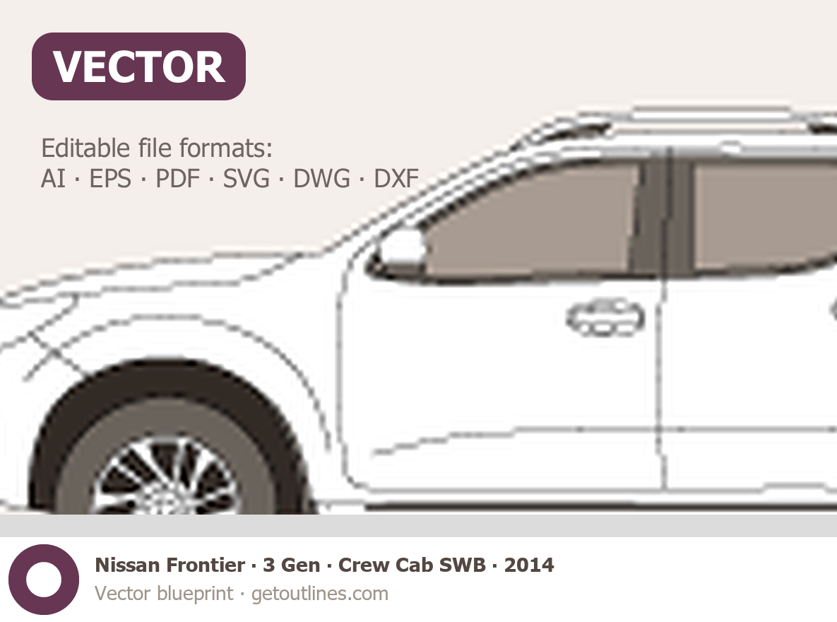 This 2014 Nissan Frontier 3 Gen Crew Cab SWB Pickup Truck blueprint helps designers, wrap studios, and 3D artists simplify their workflow and save valuable time for creative work instead of routine tasks.