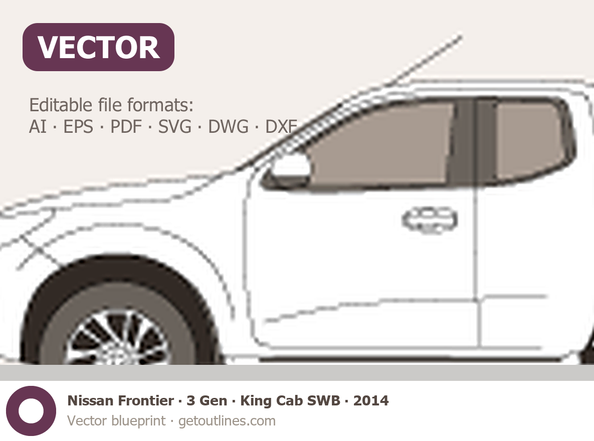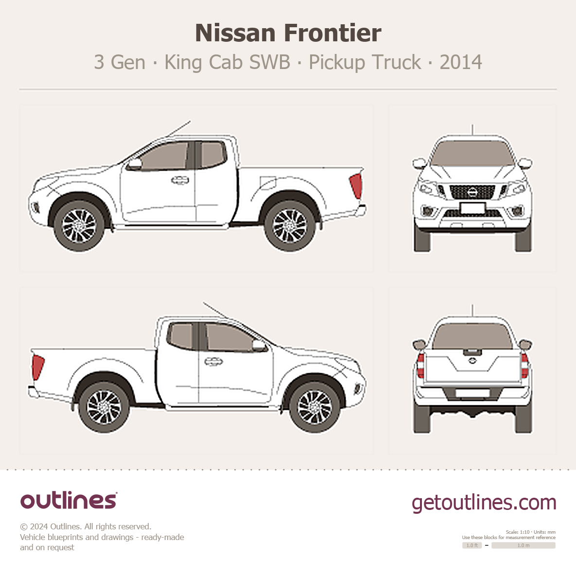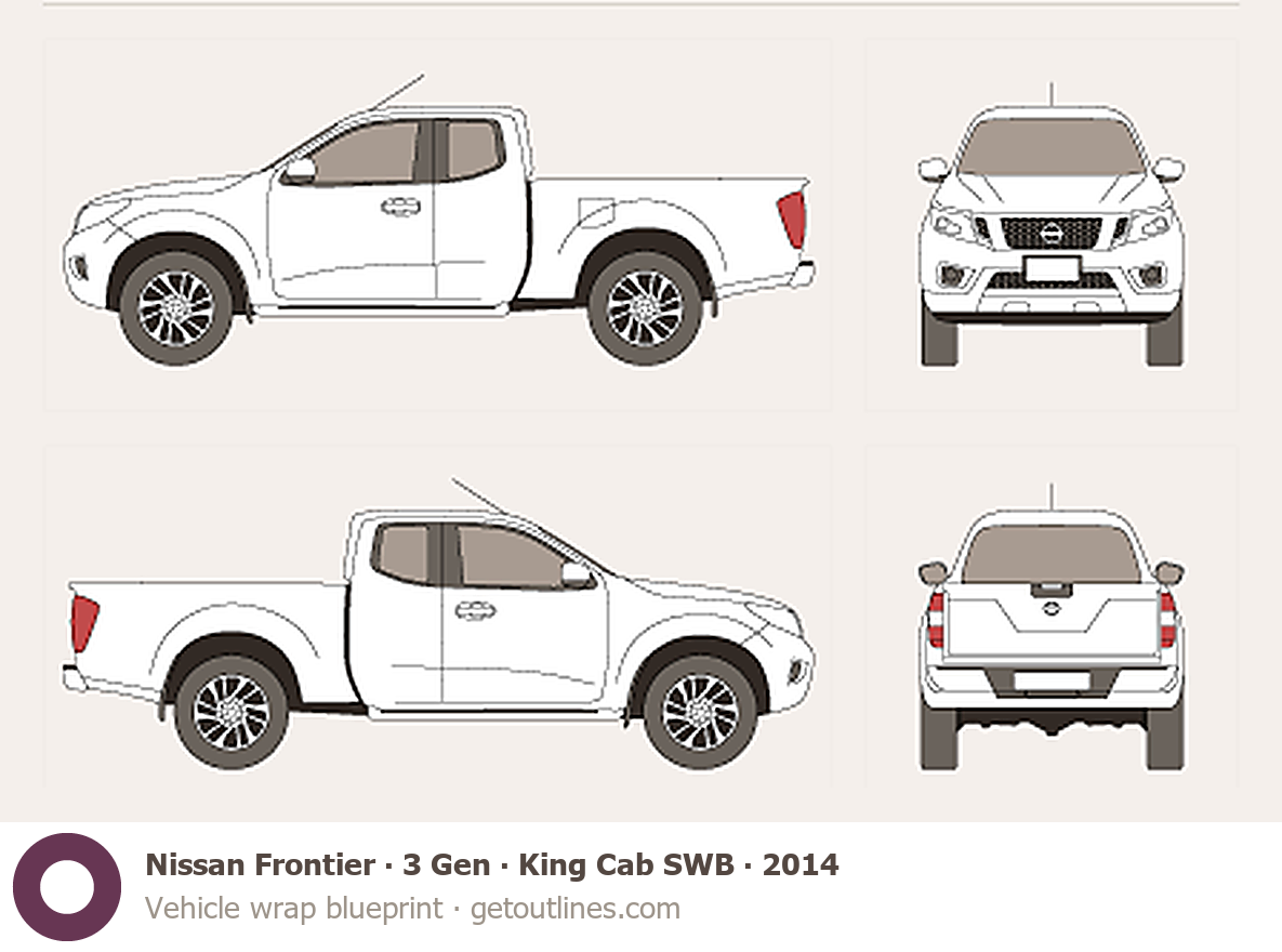 This 2014 Nissan Frontier 3 Gen King Cab SWB Pickup Truck blueprint helps designers, wrap studios, and 3D artists simplify their workflow and save valuable time for creative work instead of routine tasks.
