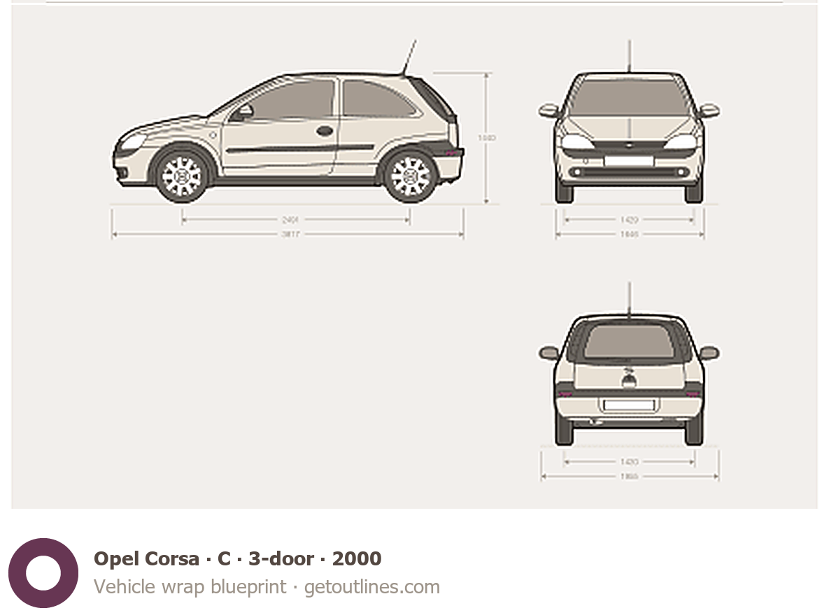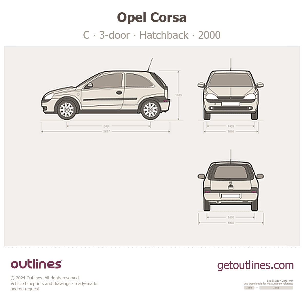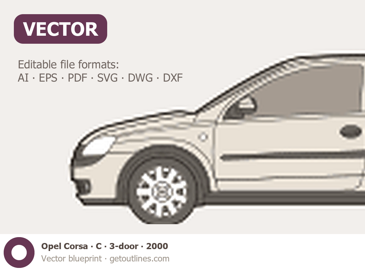 Buy this Opel Corsa C blueprint and line drawing in high-quality editable vector file formats. Best for 3D and car wrap design.