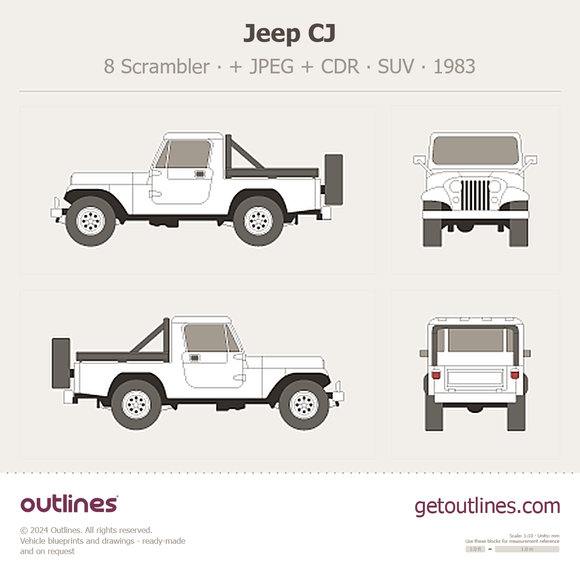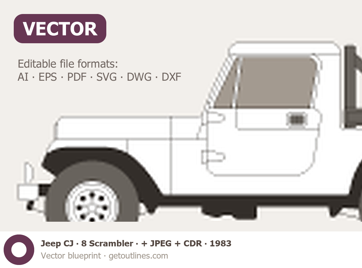 Buy this Jeep CJ 8 Scrambler blueprint and line drawing in high-quality editable vector file formats. Best for 3D and car wrap design.