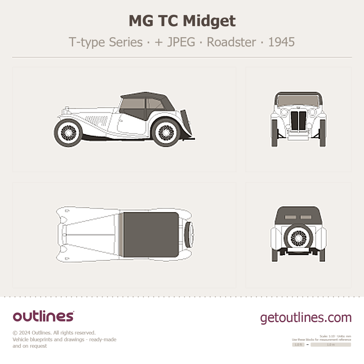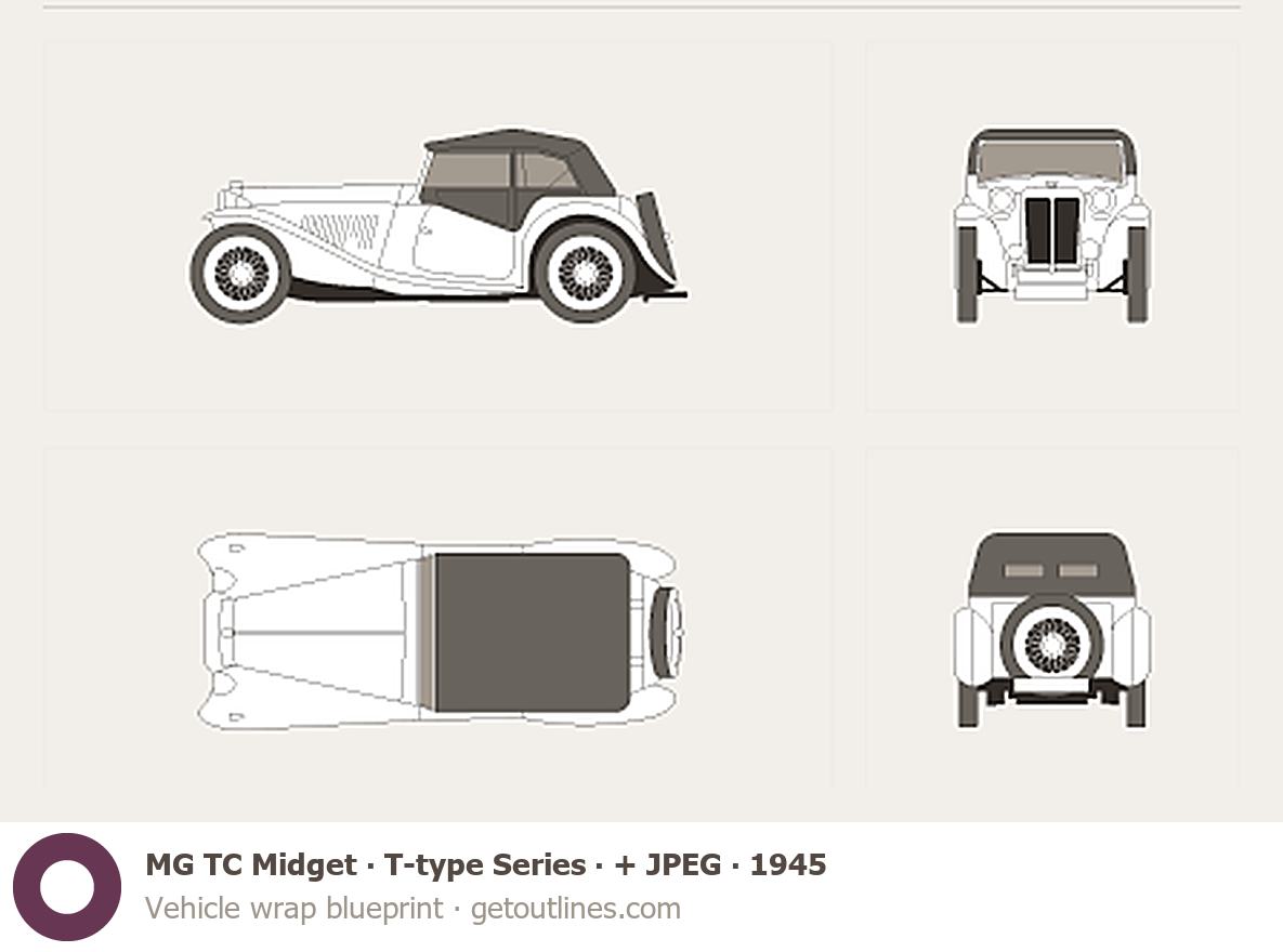 Buy this MG TC Midget T-type Series blueprint and line drawing in high-quality editable vector file formats. Best for 3D and car wrap design.