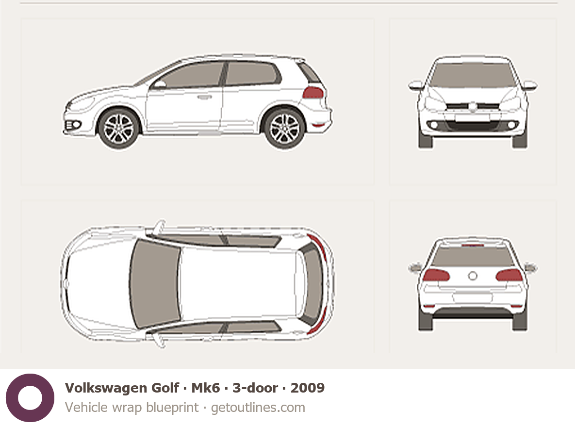 Buy this Volkswagen Golf Mk6 blueprint and line drawing in high-quality editable vector file formats. Best for 3D and car wrap design.