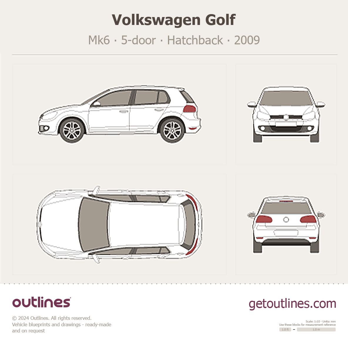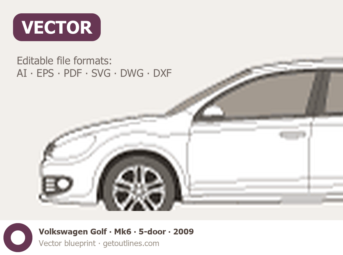 Buy this Volkswagen Golf Mk6 blueprint and line drawing in high-quality editable vector file formats. Best for 3D and car wrap design.