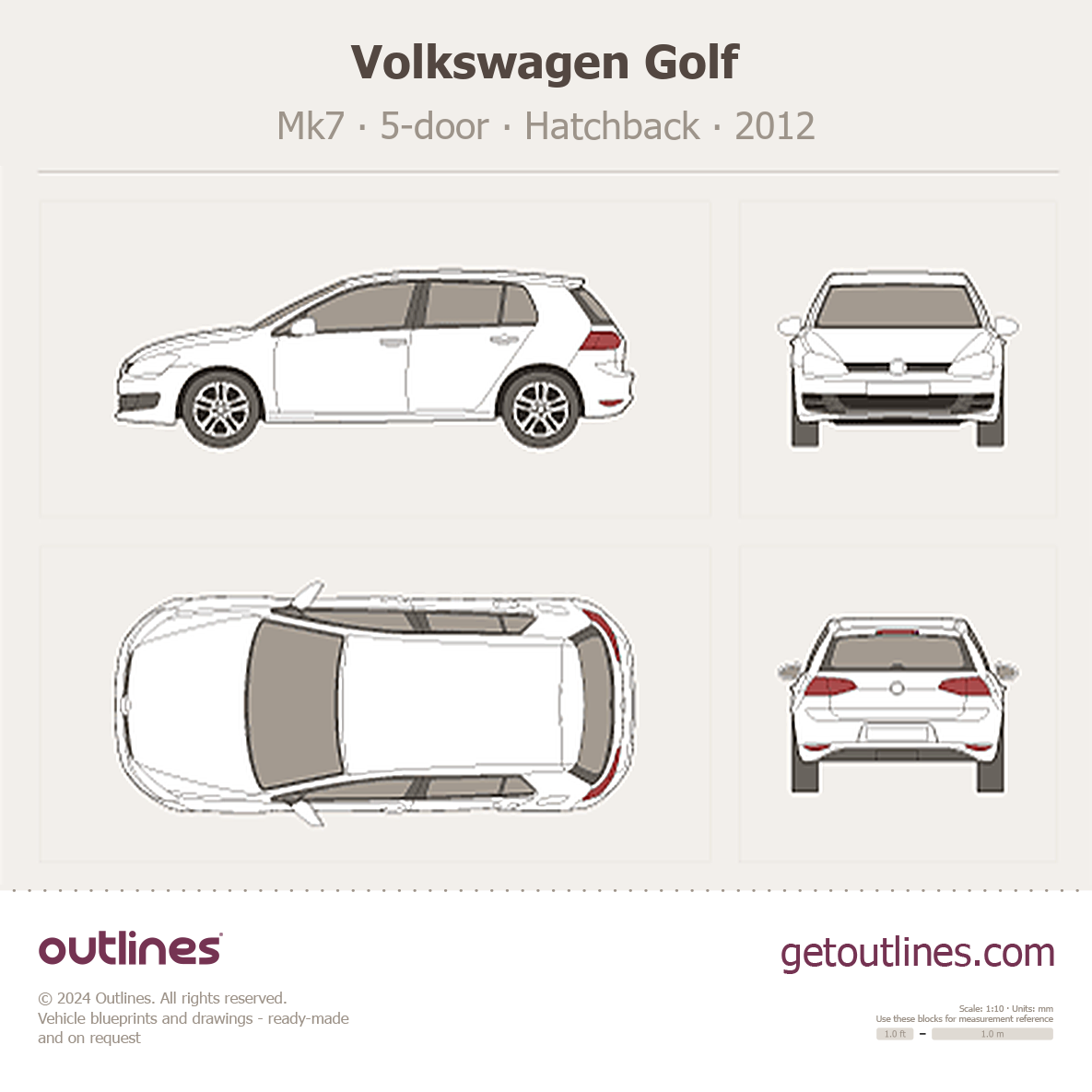 This is a blueprint of the Golf, produced by carmaker Volkswagen in 2012 - Present (2025, 2026). It features a Hatchback body design and is classified as a Family vehicle.