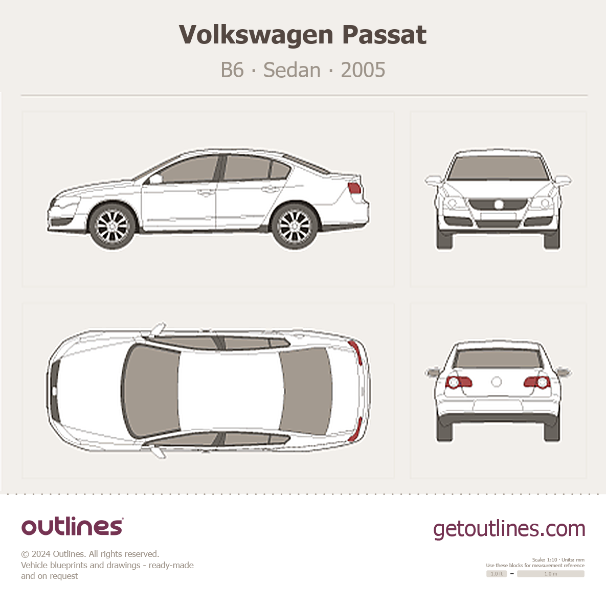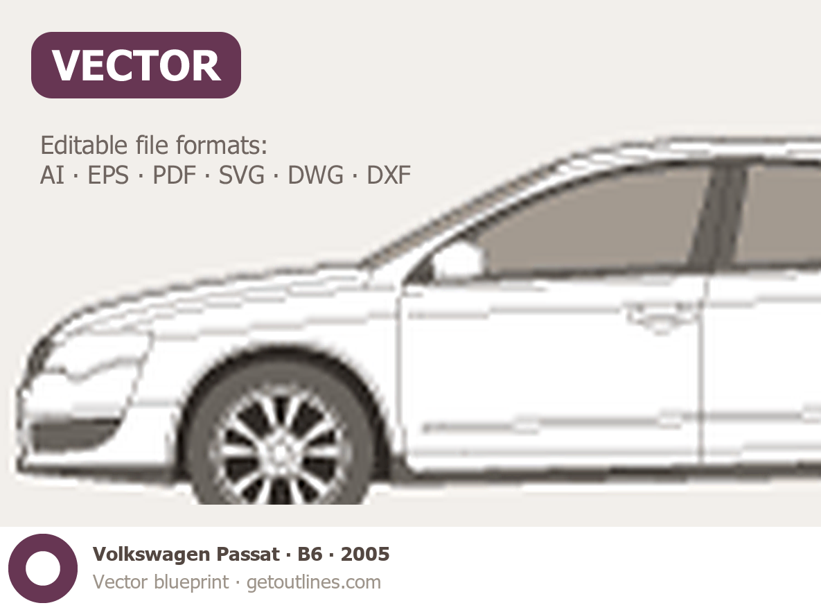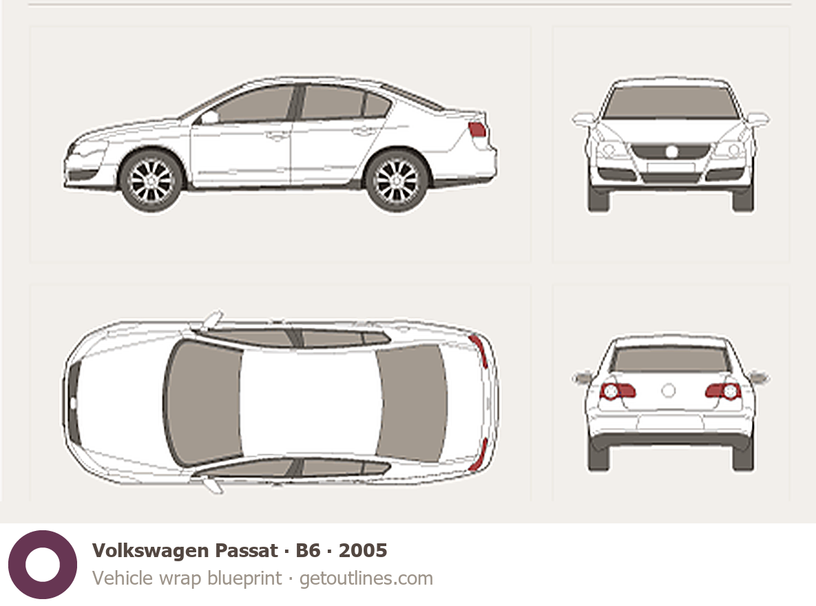 This 2005 Volkswagen Passat B6 Sedan blueprint helps designers, wrap studios, and 3D artists simplify their workflow and save valuable time for creative work instead of routine tasks.