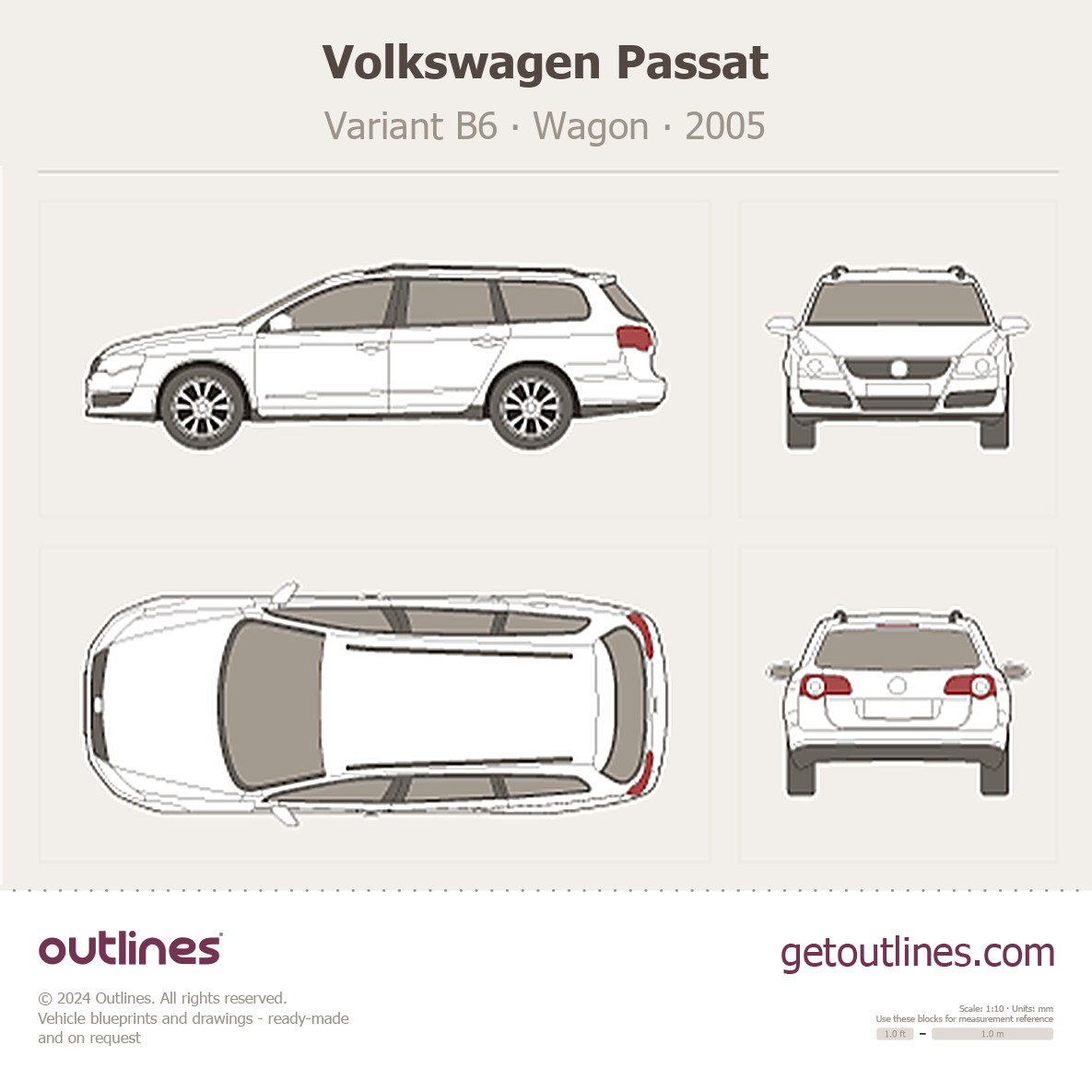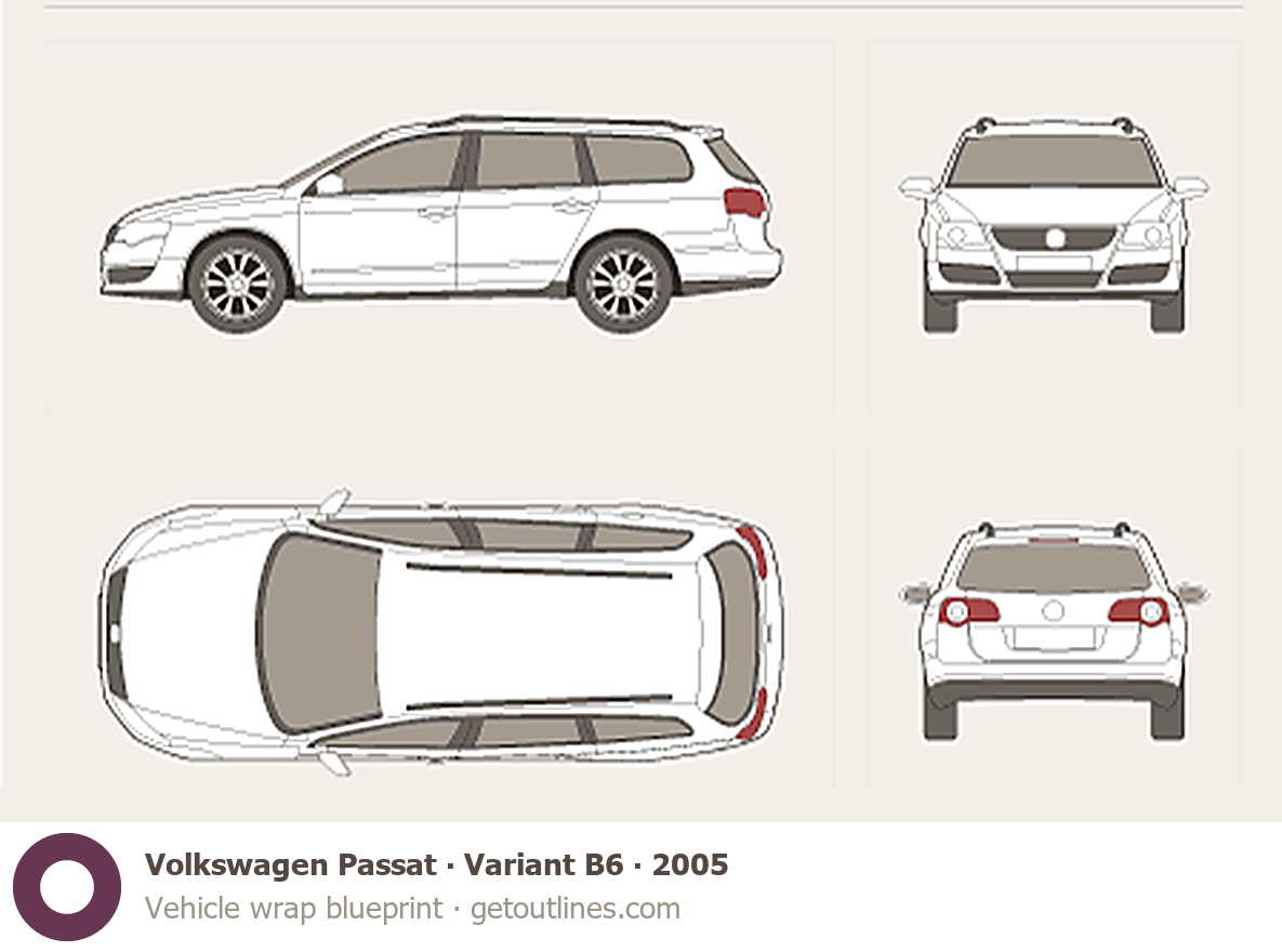 This 2005 Volkswagen Passat Variant B6 Wagon blueprint helps designers, wrap studios, and 3D artists simplify their workflow and save valuable time for creative work instead of routine tasks.