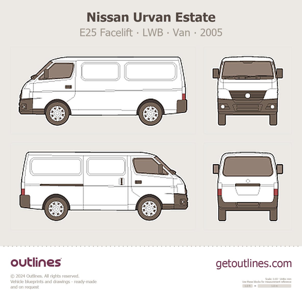 This 2005 Nissan Urvan Estate E25 Facelift LWB Van blueprint helps designers, wrap studios, and 3D artists simplify their workflow and save valuable time for creative work instead of routine tasks.