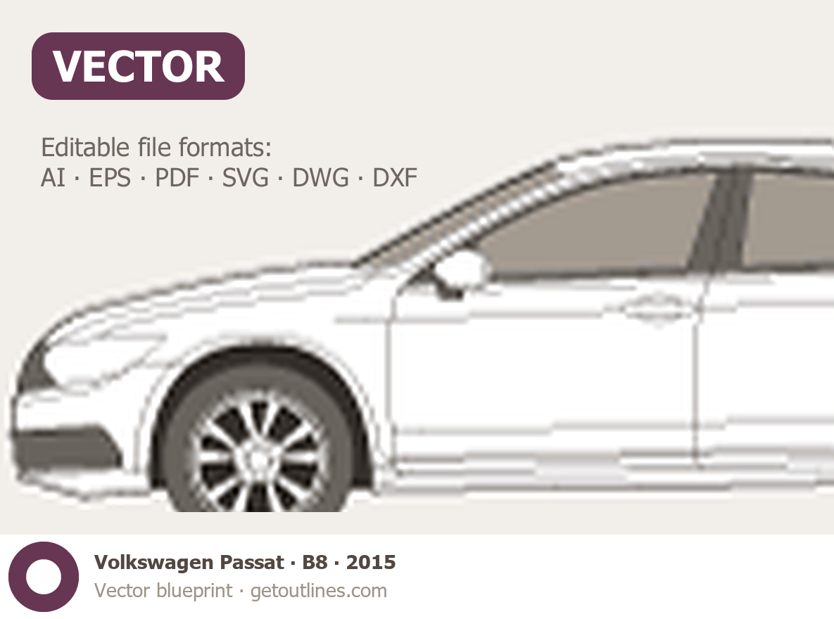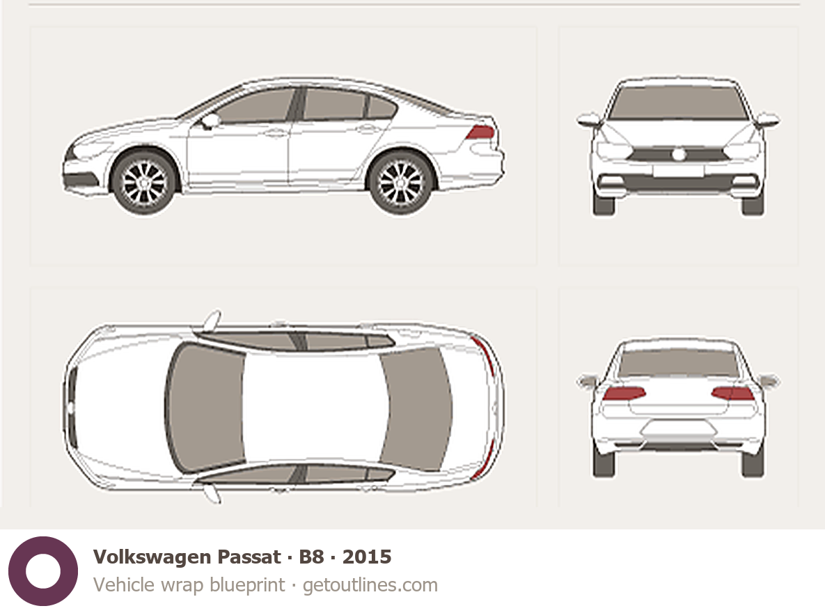 This 2015 Volkswagen Passat B8 Sedan blueprint helps designers, wrap studios, and 3D artists simplify their workflow and save valuable time for creative work instead of routine tasks.