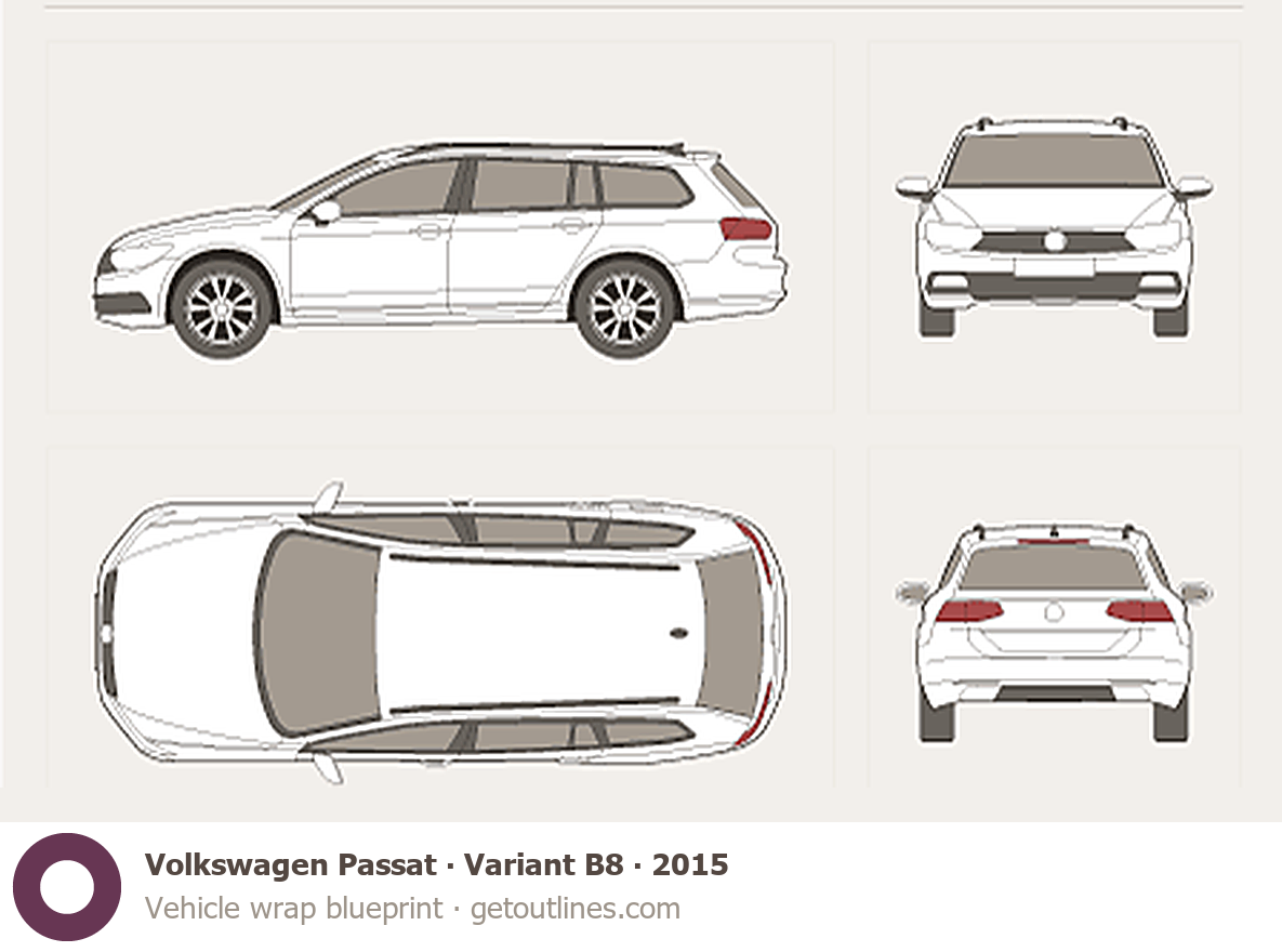 This 2015 Volkswagen Passat Variant B8 Wagon blueprint helps designers, wrap studios, and 3D artists simplify their workflow and save valuable time for creative work instead of routine tasks.