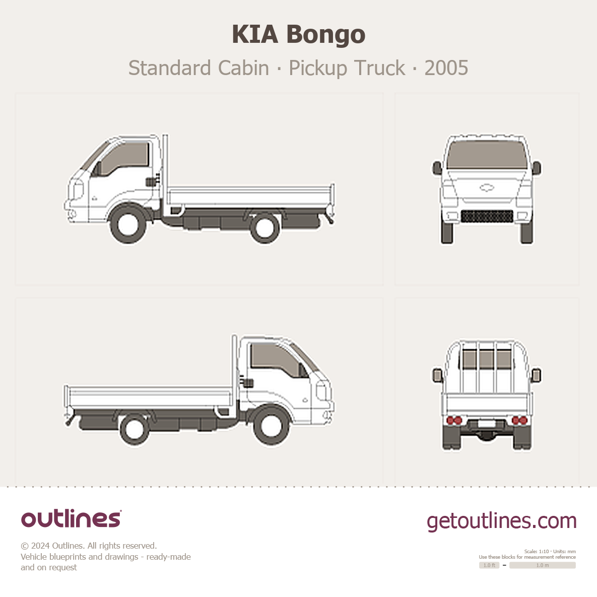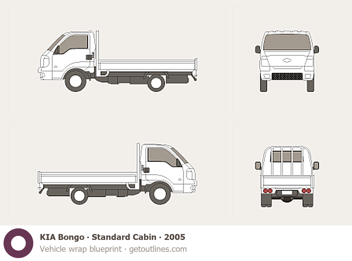 This 2005 KIA Bongo Standard Cabin Pickup Truck blueprint helps designers, wrap studios, and 3D artists simplify their workflow and save valuable time for creative work instead of routine tasks.