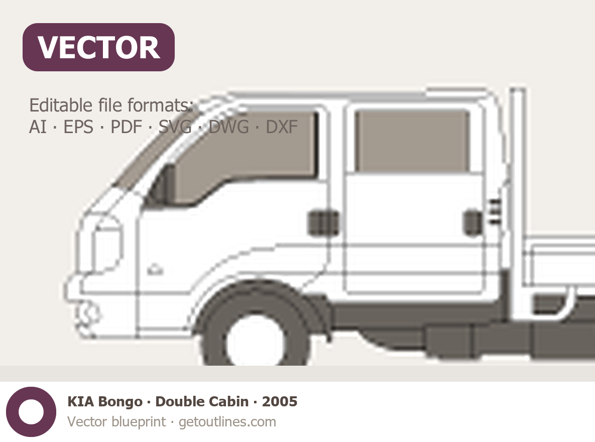This 2005 KIA Bongo Double Cabin Pickup Truck blueprint helps designers, wrap studios, and 3D artists simplify their workflow and save valuable time for creative work instead of routine tasks.