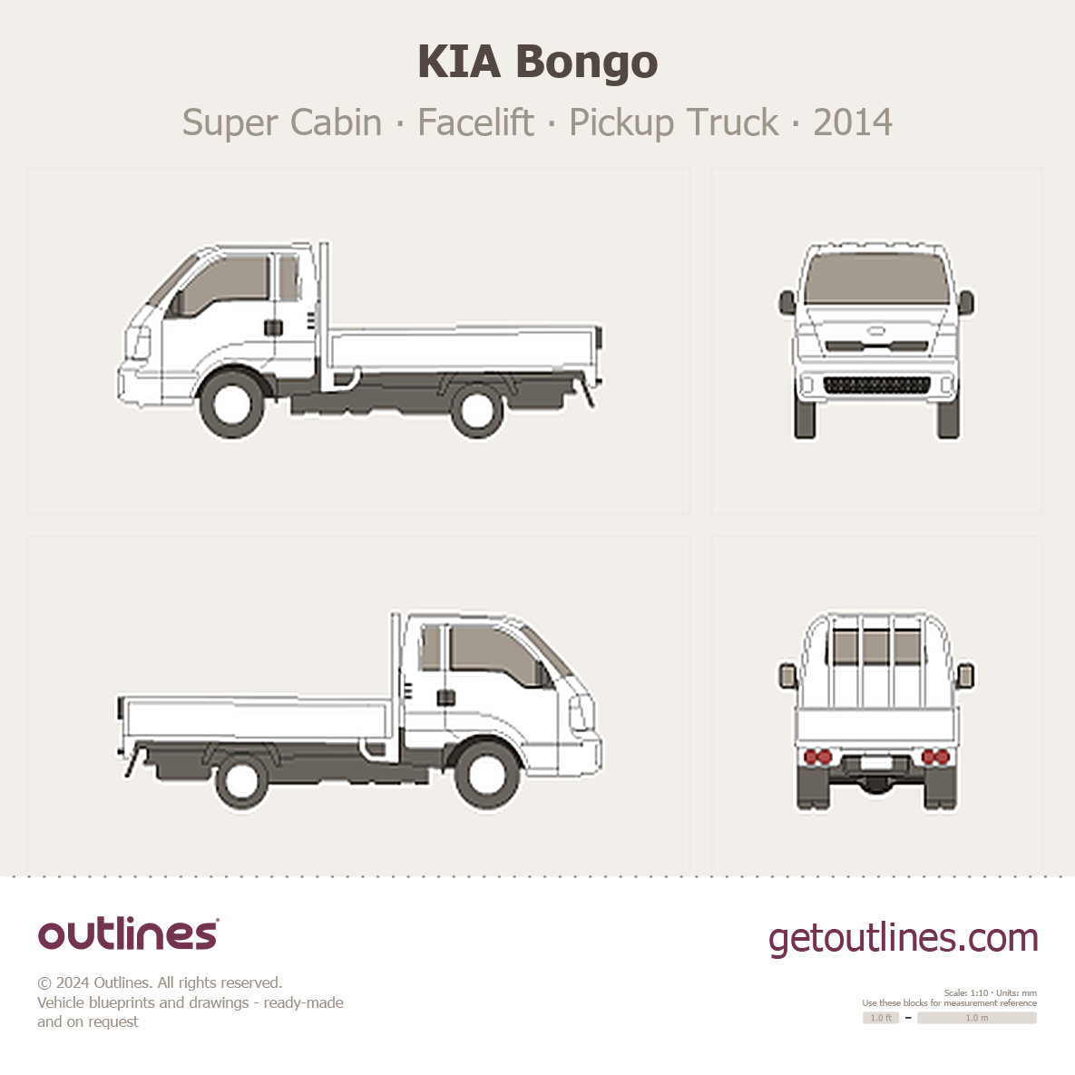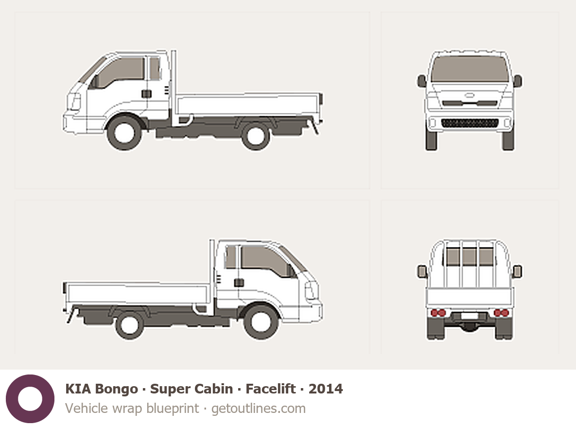 This 2014 KIA Bongo Super Cabin Facelift Pickup Truck blueprint helps designers, wrap studios, and 3D artists simplify their workflow and save valuable time for creative work instead of routine tasks.