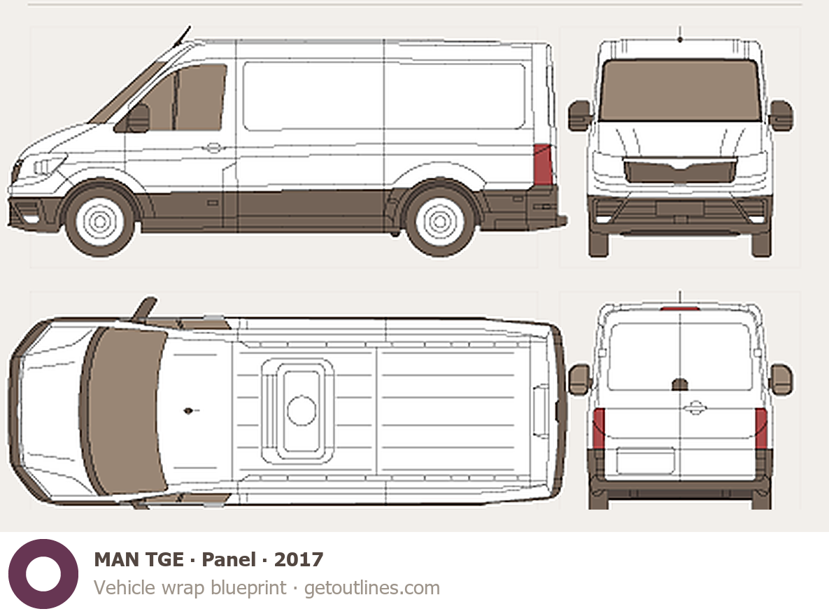 This template is suitable for MAN TGE models from 2017, including 2017, 2018, 2019, 2020, and 2026 model years, and is commonly used for vehicle wrap and signage design.
