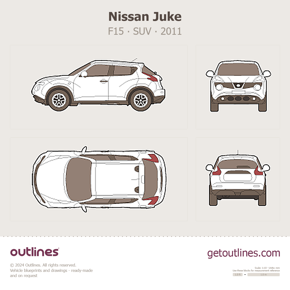 This 2011 Nissan Juke F15 SUV blueprint helps designers, wrap studios, and 3D artists simplify their workflow and save valuable time for creative work instead of routine tasks.