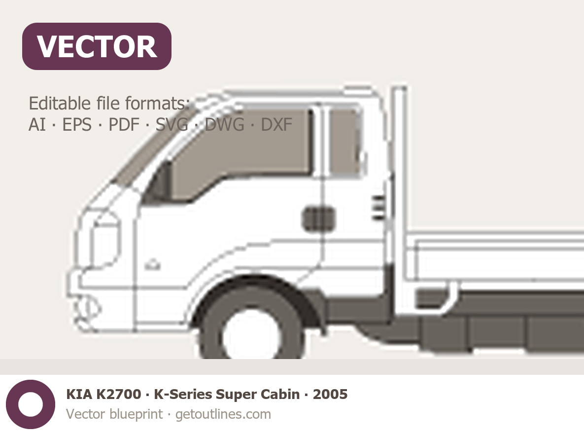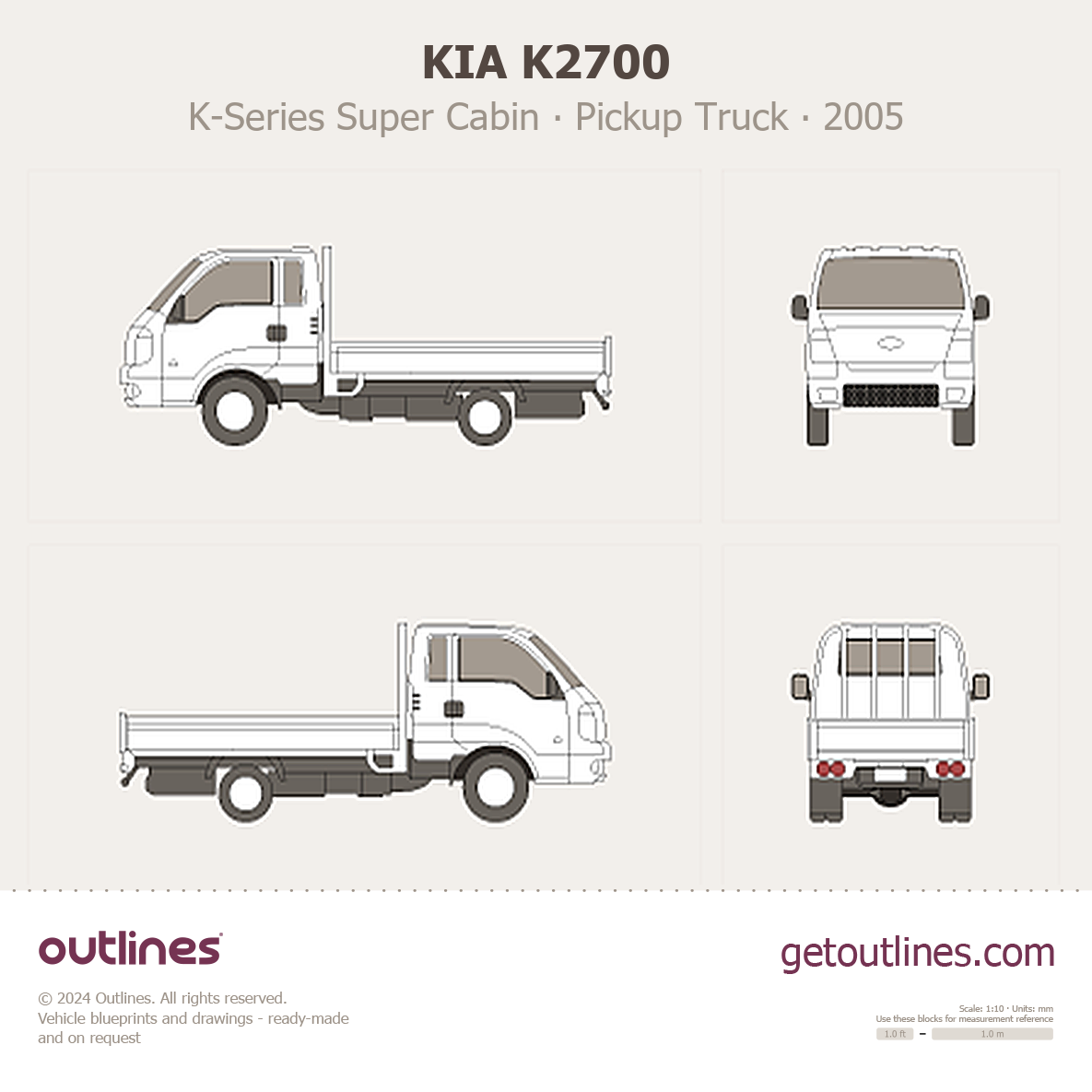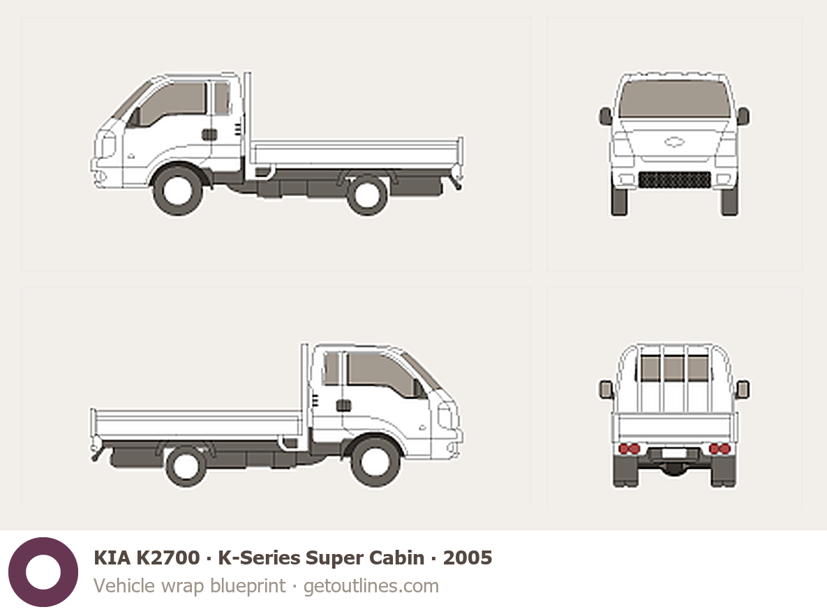 This 2005 KIA K2700 K-Series Super Cabin Pickup Truck blueprint helps designers, wrap studios, and 3D artists simplify their workflow and save valuable time for creative work instead of routine tasks.