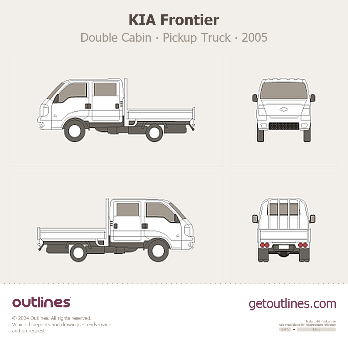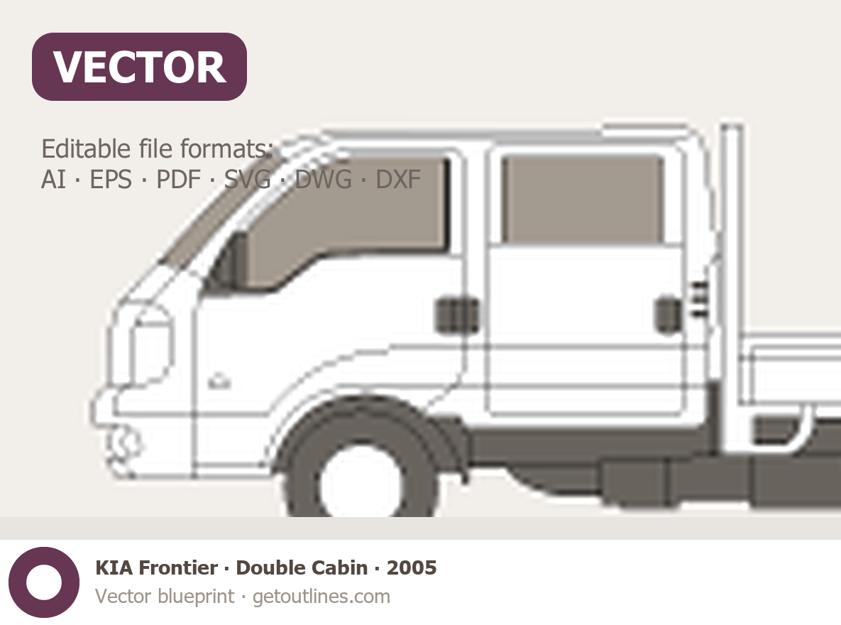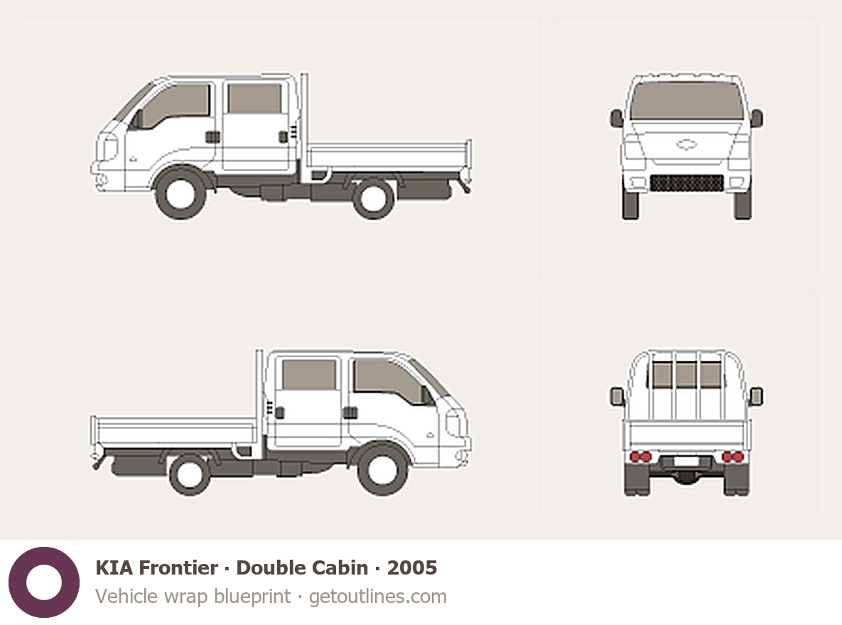 This 2005 KIA Frontier Double Cabin Pickup Truck blueprint helps designers, wrap studios, and 3D artists simplify their workflow and save valuable time for creative work instead of routine tasks.