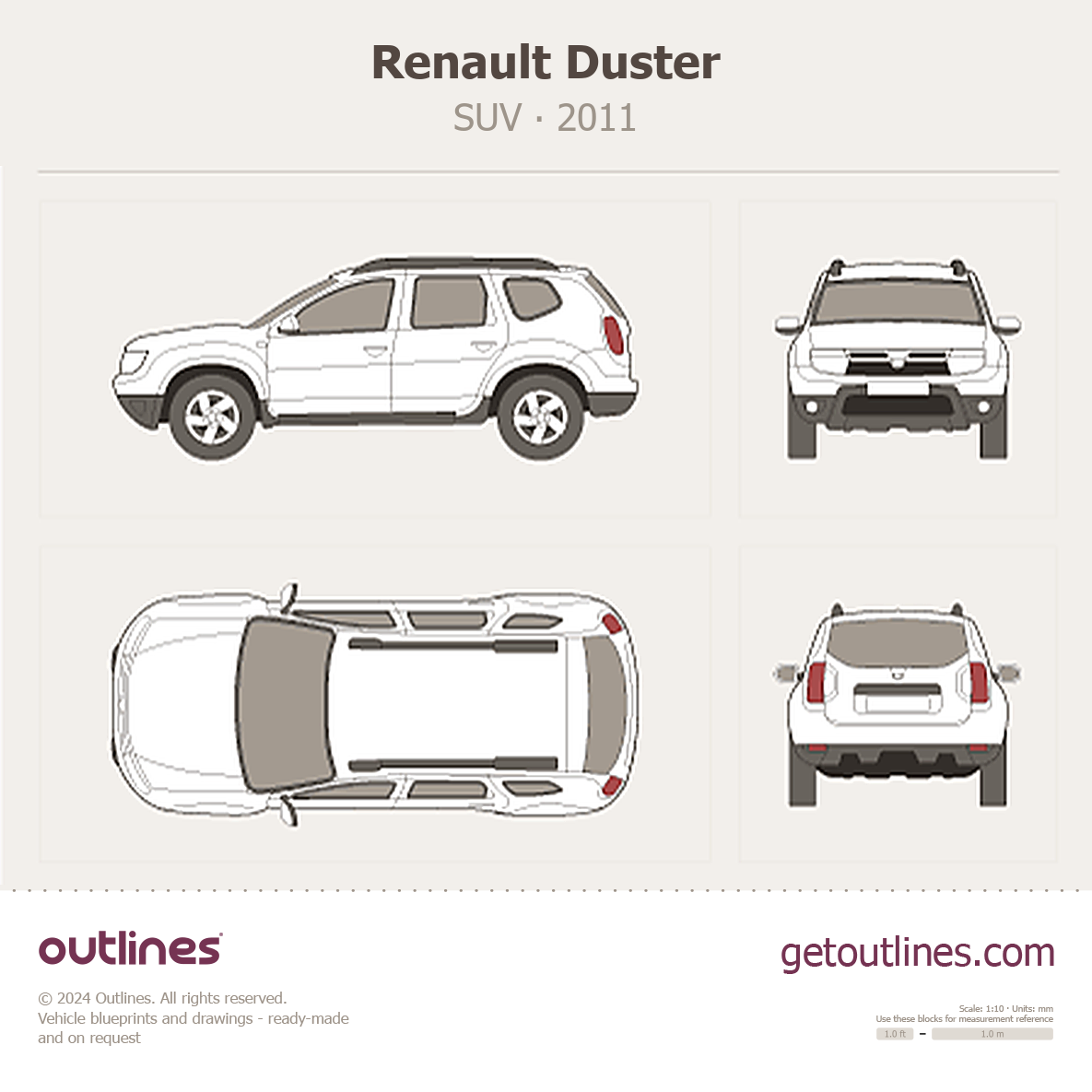 Buy this Renault Duster blueprint and line drawing in high-quality editable vector file formats. Best for 3D and car wrap design.