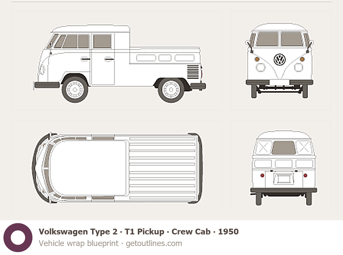 This 1950 Volkswagen Type 2 T1 Pickup Crew Cab Pickup Truck blueprint helps designers, wrap studios, and 3D artists simplify their workflow and save valuable time for creative work instead of routine tasks.