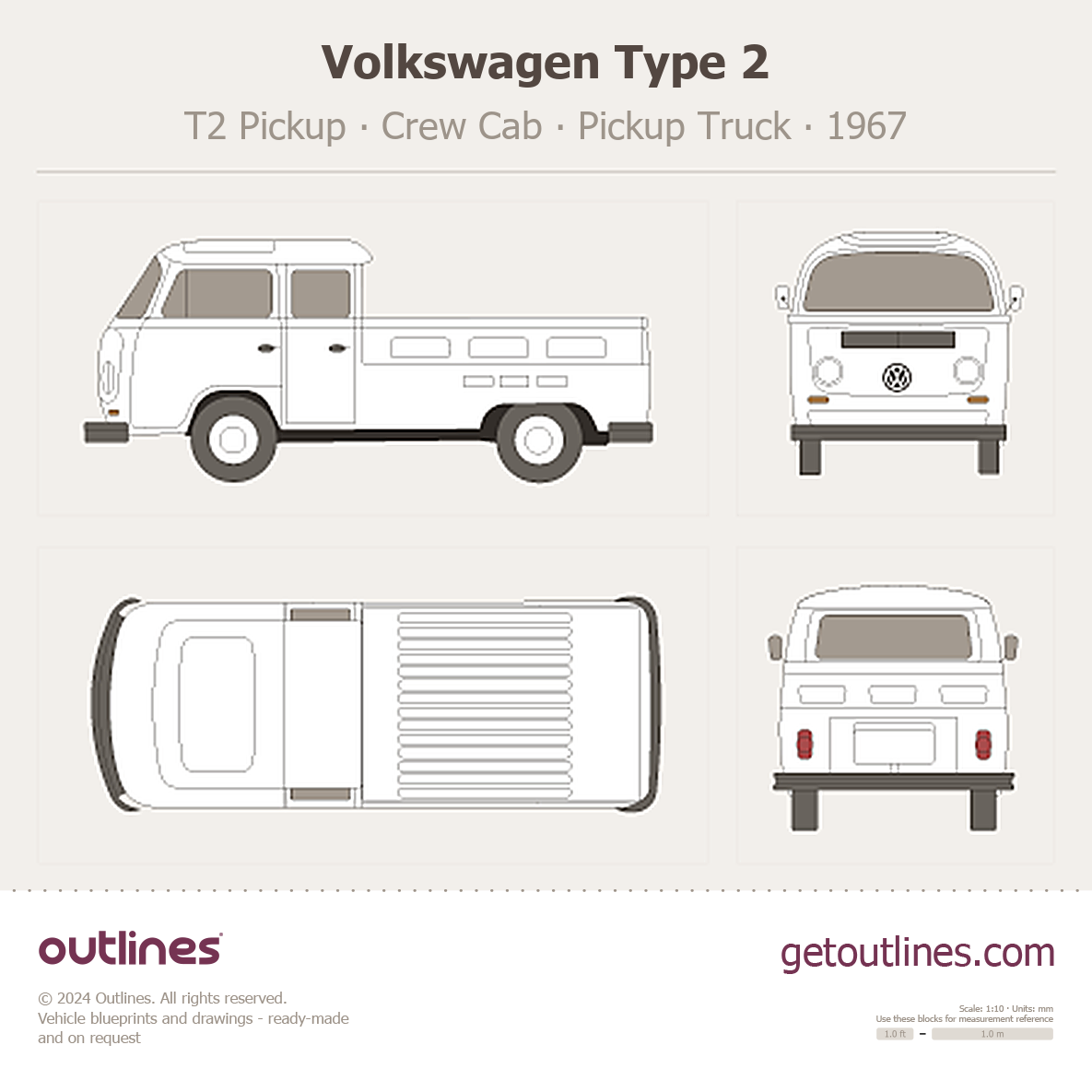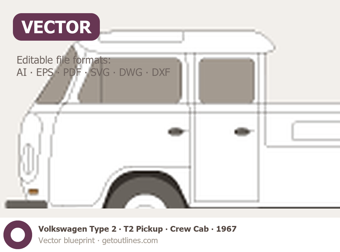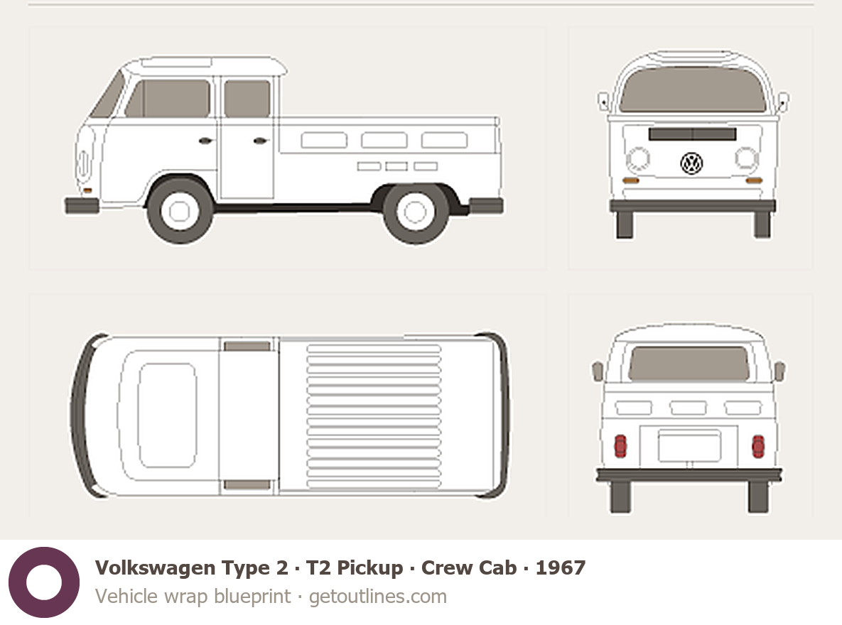 This 1967 Volkswagen Type 2 T2 Pickup Crew Cab Pickup Truck blueprint helps designers, wrap studios, and 3D artists simplify their workflow and save valuable time for creative work instead of routine tasks.