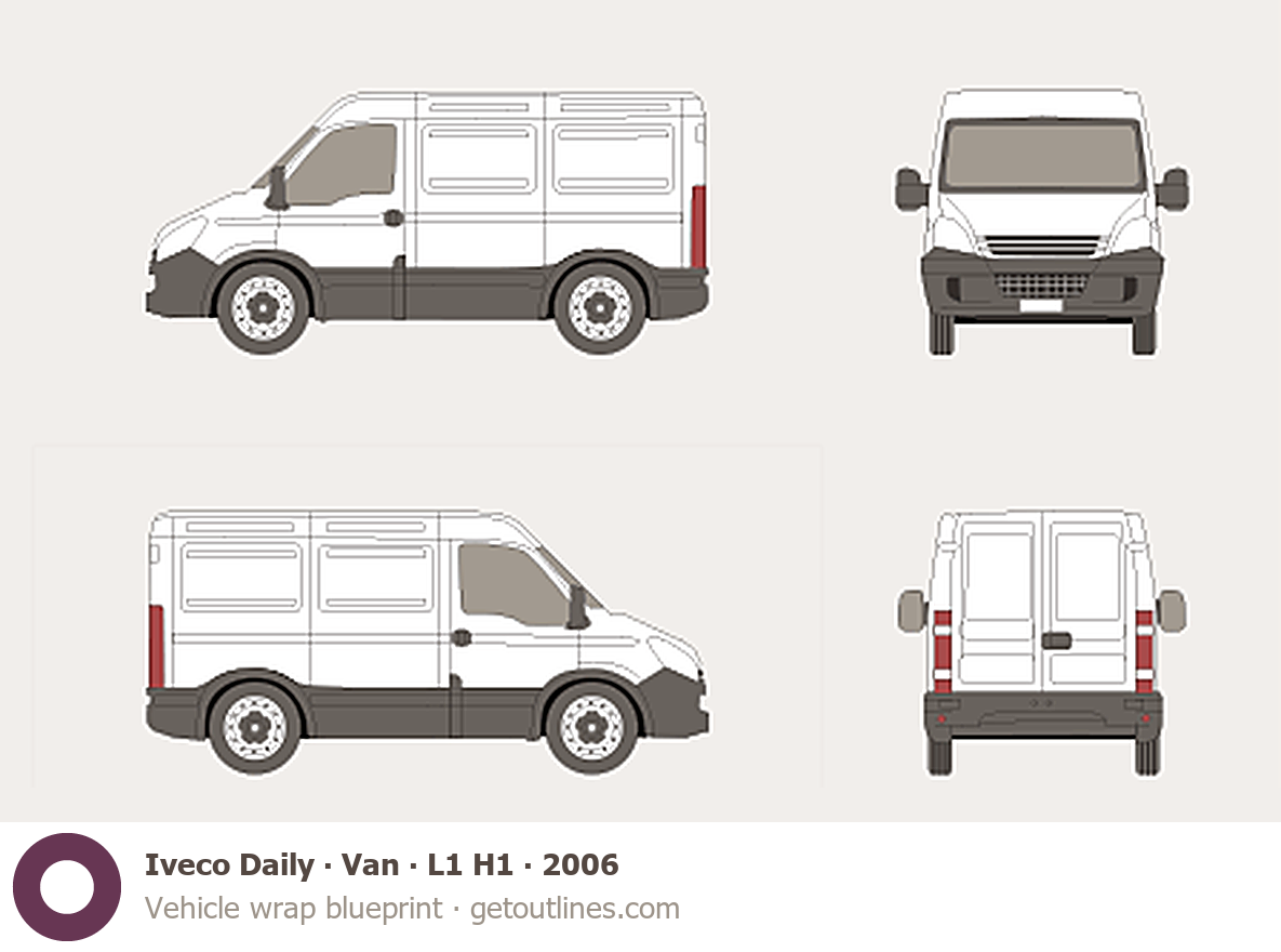 This 2006 Iveco Daily Van L1 H1 Van blueprint helps designers, wrap studios, and 3D artists simplify their workflow and save valuable time for creative work instead of routine tasks.