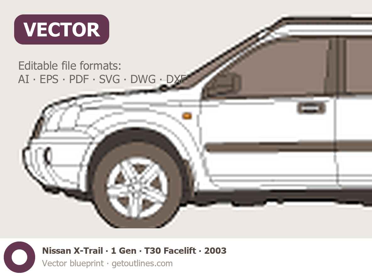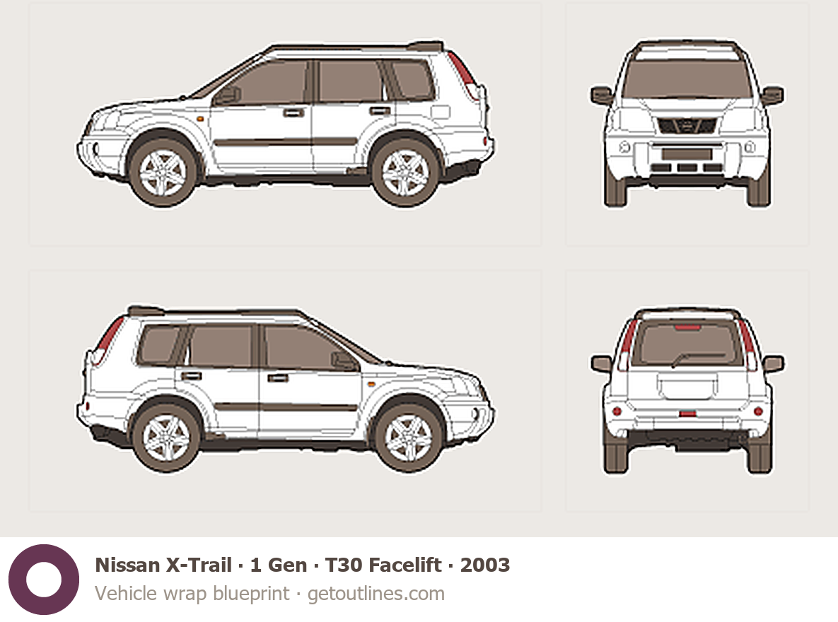 This 2003 Nissan X-Trail 1 Gen ∙ T30 Facelift SUV blueprint helps designers, wrap studios, and 3D artists simplify their workflow and save valuable time for creative work instead of routine tasks.