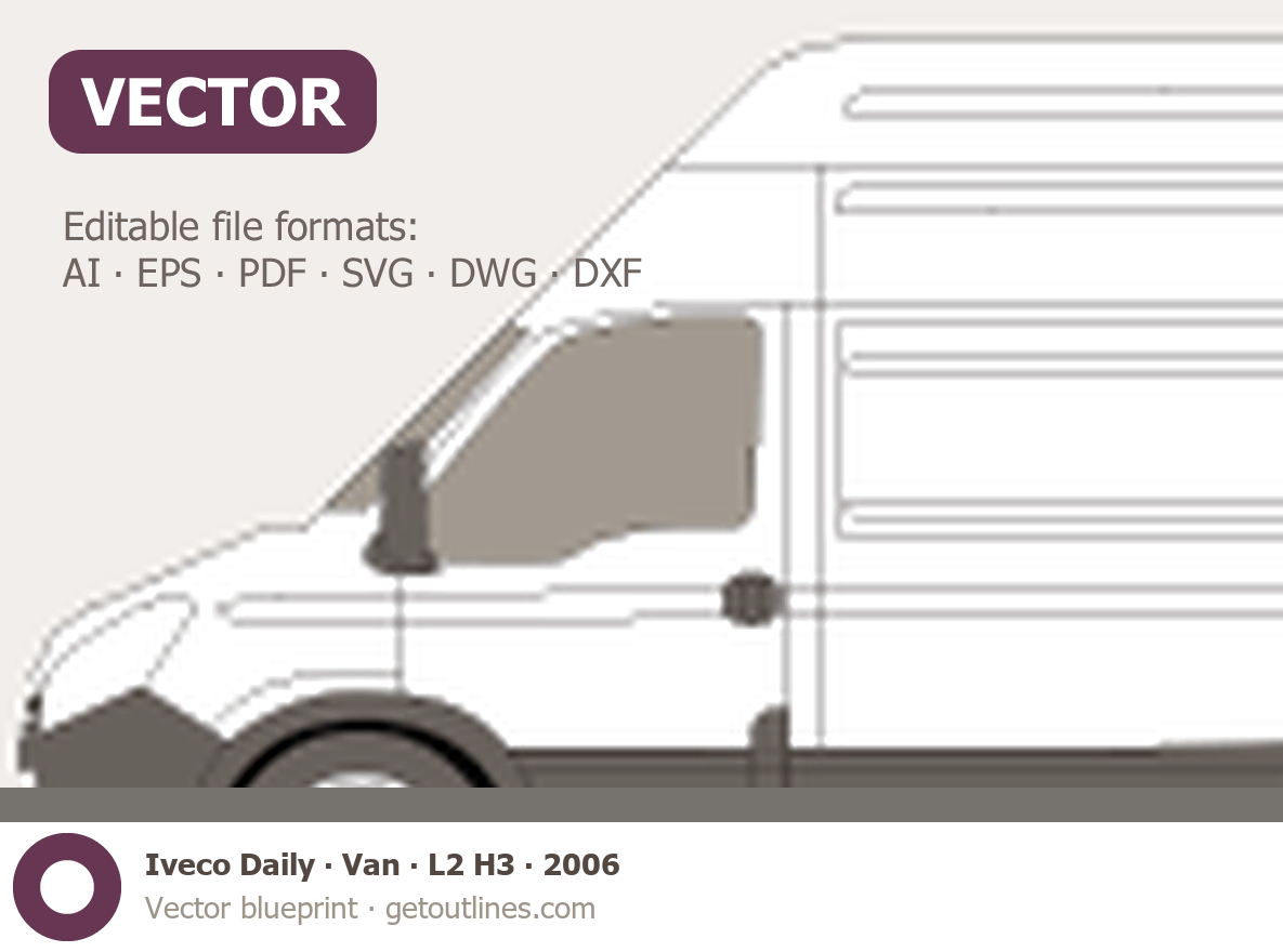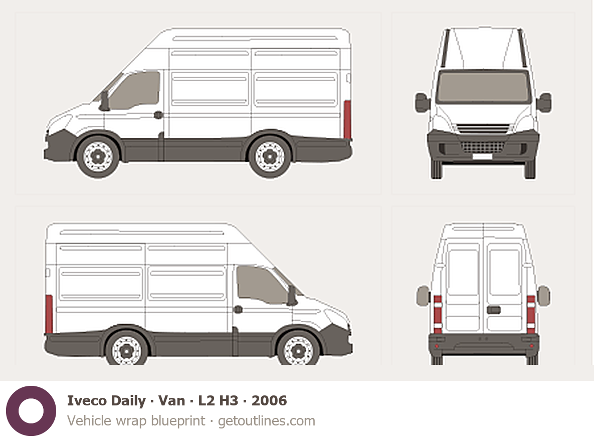 This 2006 Iveco Daily Van L2 H3 Van blueprint helps designers, wrap studios, and 3D artists simplify their workflow and save valuable time for creative work instead of routine tasks.