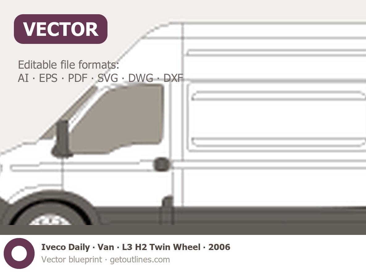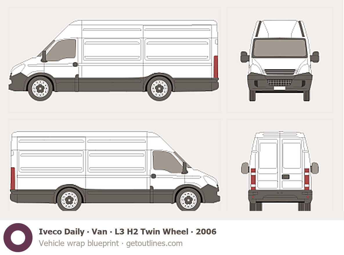 This 2006 Iveco Daily Van L3 H2 Twin Wheel Van blueprint helps designers, wrap studios, and 3D artists simplify their workflow and save valuable time for creative work instead of routine tasks.