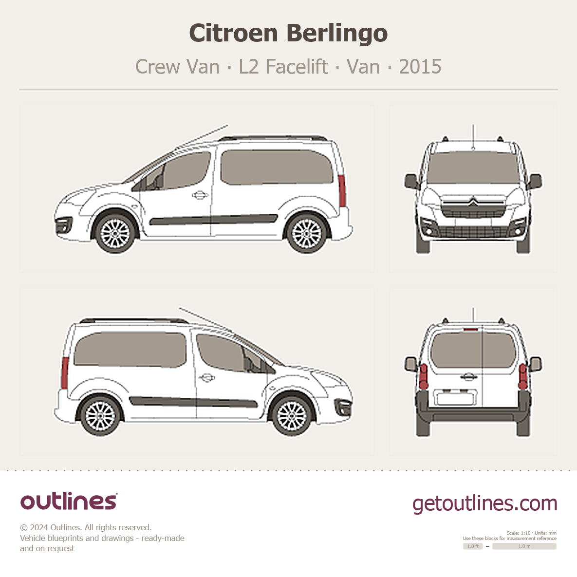 This is a blueprint of the Berlingo, produced by carmaker Citroen in 2015 - Present (2025, 2026). It features a Van body design and is classified as a Commercial vehicle.
