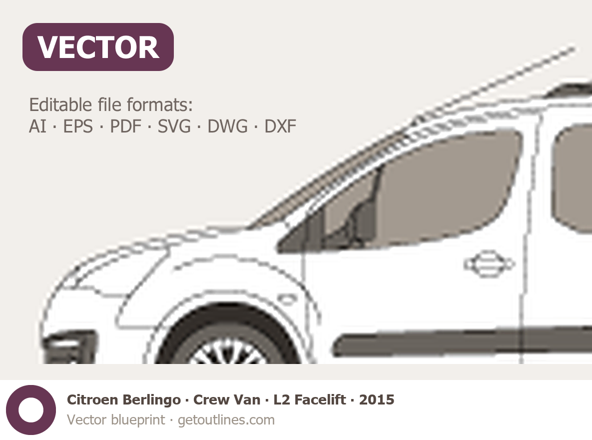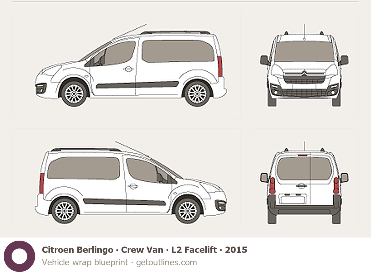 This 2015 Citroen Berlingo Crew Van L2 Facelift Van blueprint helps designers, wrap studios, and 3D artists simplify their workflow and save valuable time for creative work instead of routine tasks.