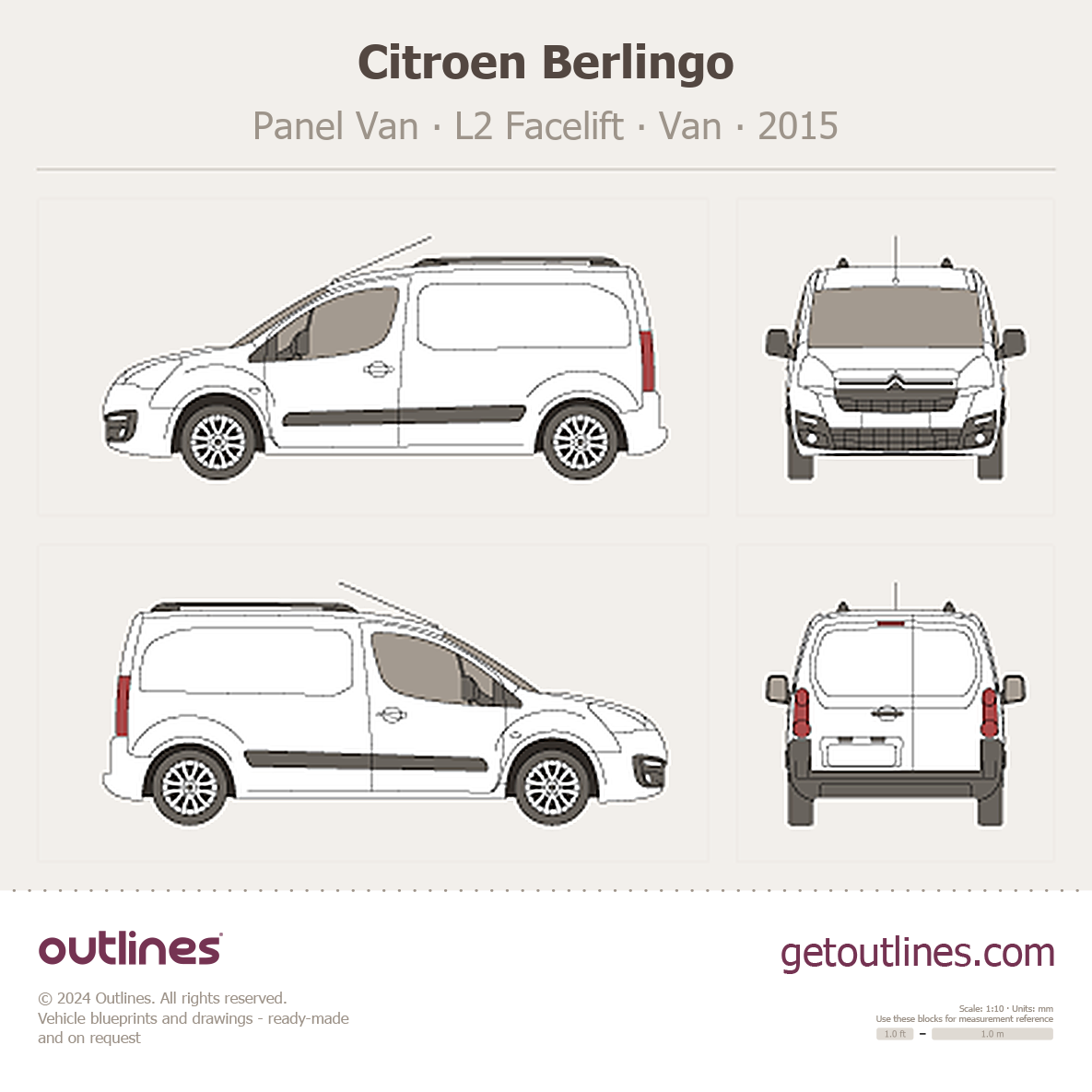 This is a blueprint of the Berlingo, produced by carmaker Citroen in 2015 - Present (2025, 2026). It features a Van body design and is classified as a Commercial vehicle.