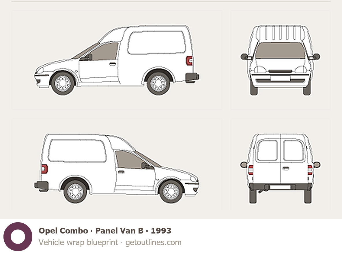 This template is suitable for Opel Combo models from 1993 to 2001, including 1993, 1994, 1995, 1996, and 2001 model years, and is commonly used for vehicle wrap and signage design.