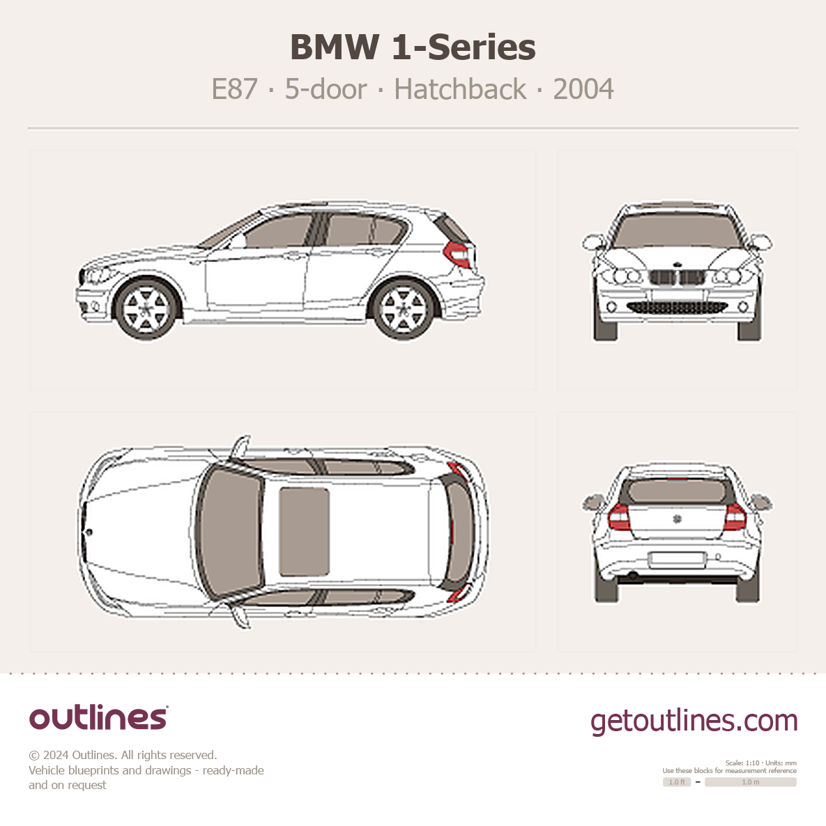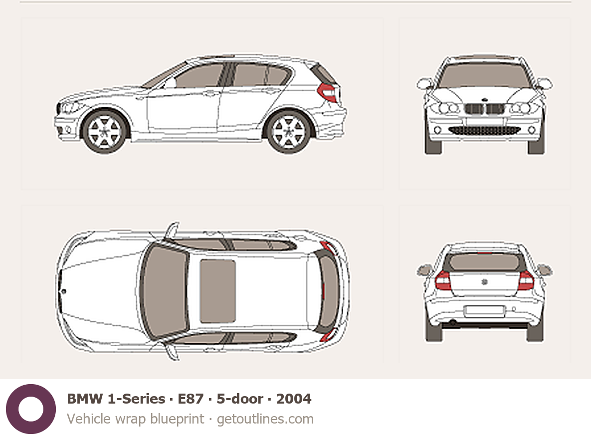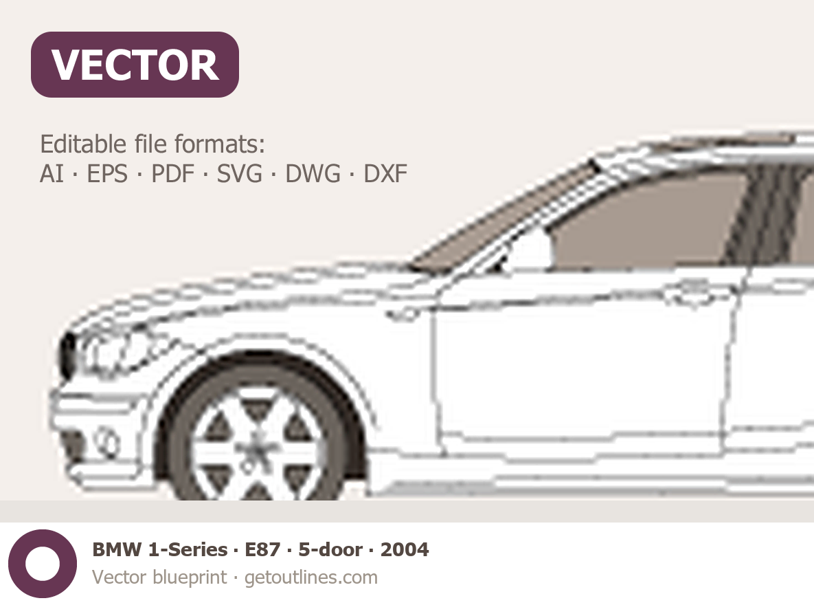 Buy this BMW 1-Series E87 blueprint and line drawing in high-quality editable vector file formats. Best for 3D and car wrap design.
