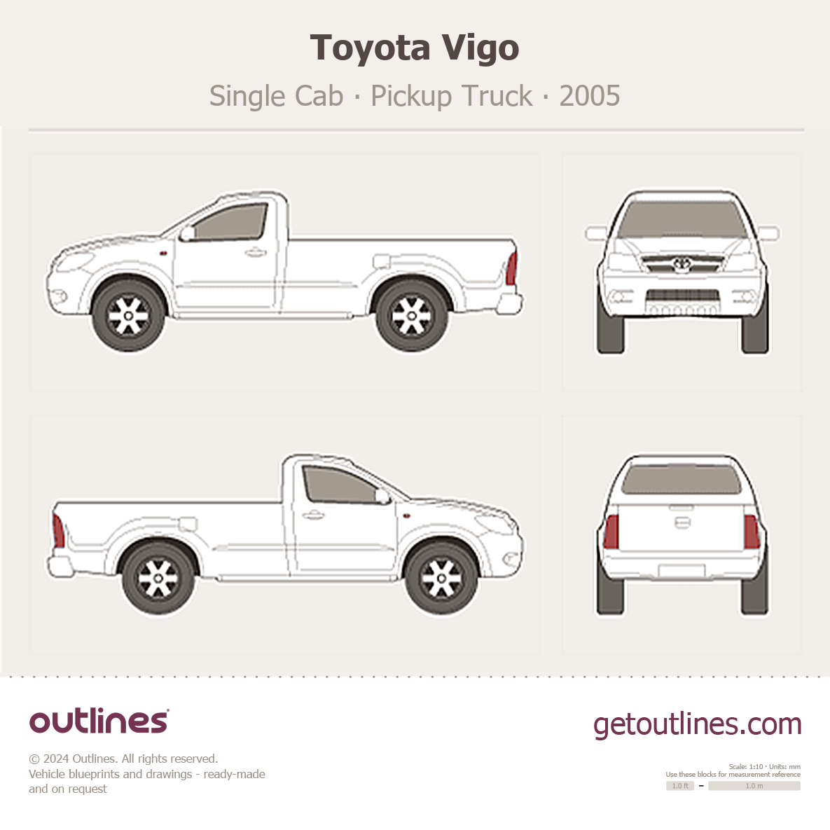This is a blueprint of the Vigo, produced by carmaker Toyota in 2005 - 2011. It features a Pickup Truck body design and is classified as a Commercial vehicle.