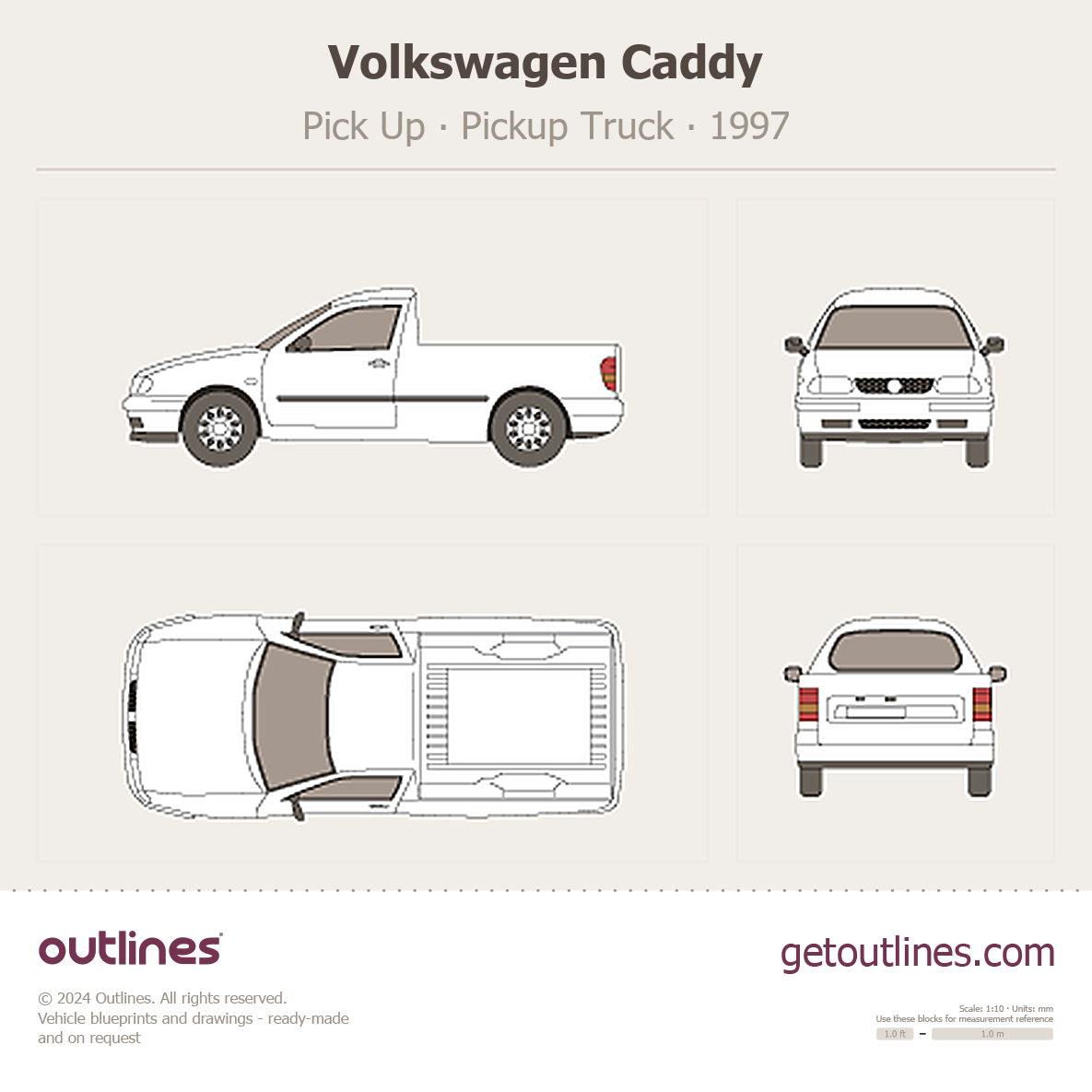 This is a blueprint of the Caddy, produced by carmaker Volkswagen in 1997 - 2003. It features a Pickup Truck body design and is classified as a Commercial vehicle.