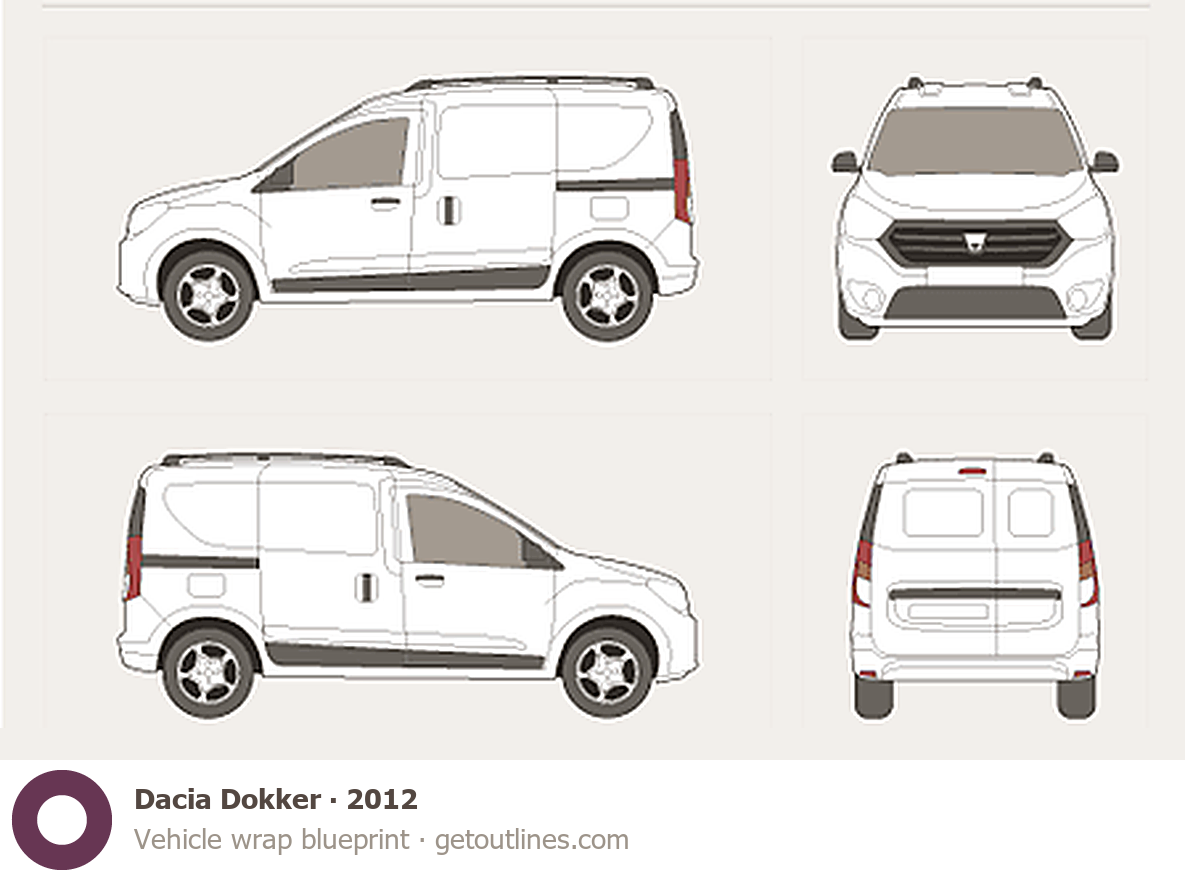 This template is suitable for Dacia Dokker models from 2012, including 2012, 2013, 2014, 2015, and 2026 model years, and is commonly used for vehicle wrap and signage design.