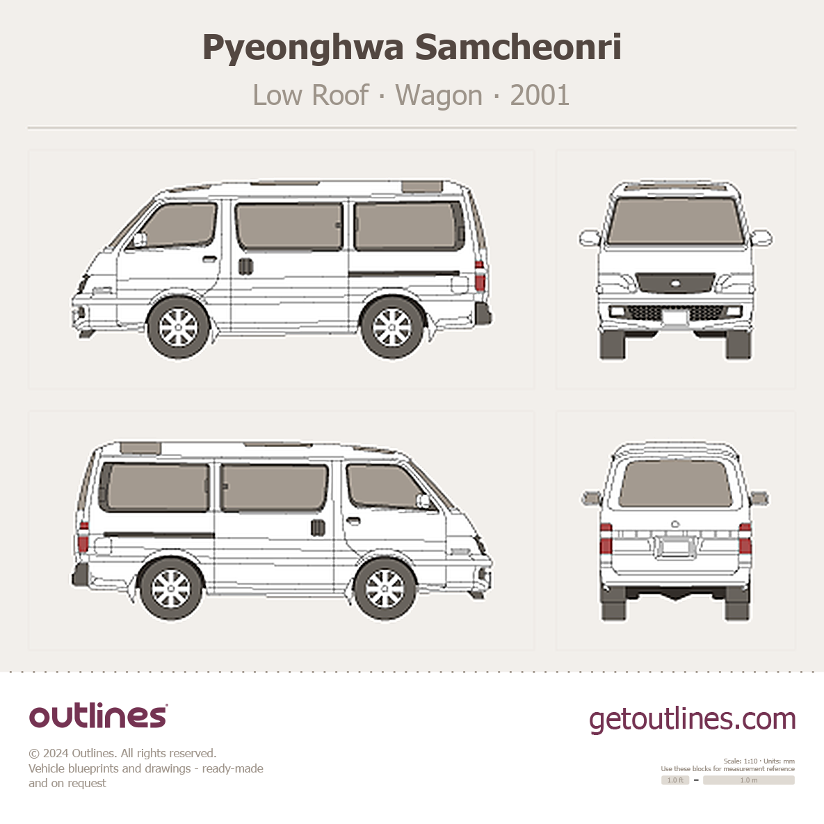 This is a blueprint of the Samcheonri, produced by carmaker Pyeonghwa in 2001 - Present (2025, 2026). It features a Wagon body design and is classified as a Commercial vehicle.