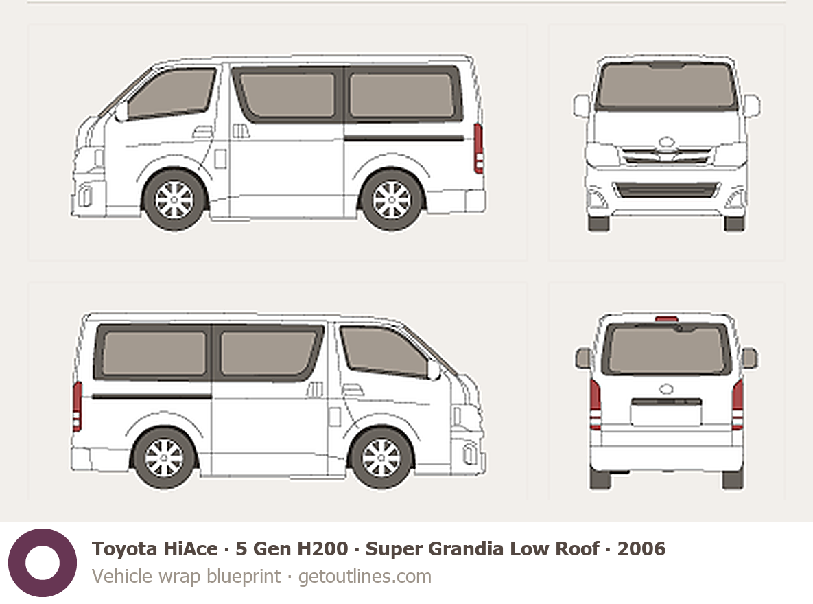 This 2006 Toyota HiAce 5 Gen H200 Super Grandia Low Roof Wagon blueprint helps designers, wrap studios, and 3D artists simplify their workflow and save valuable time for creative work instead of routine tasks.
