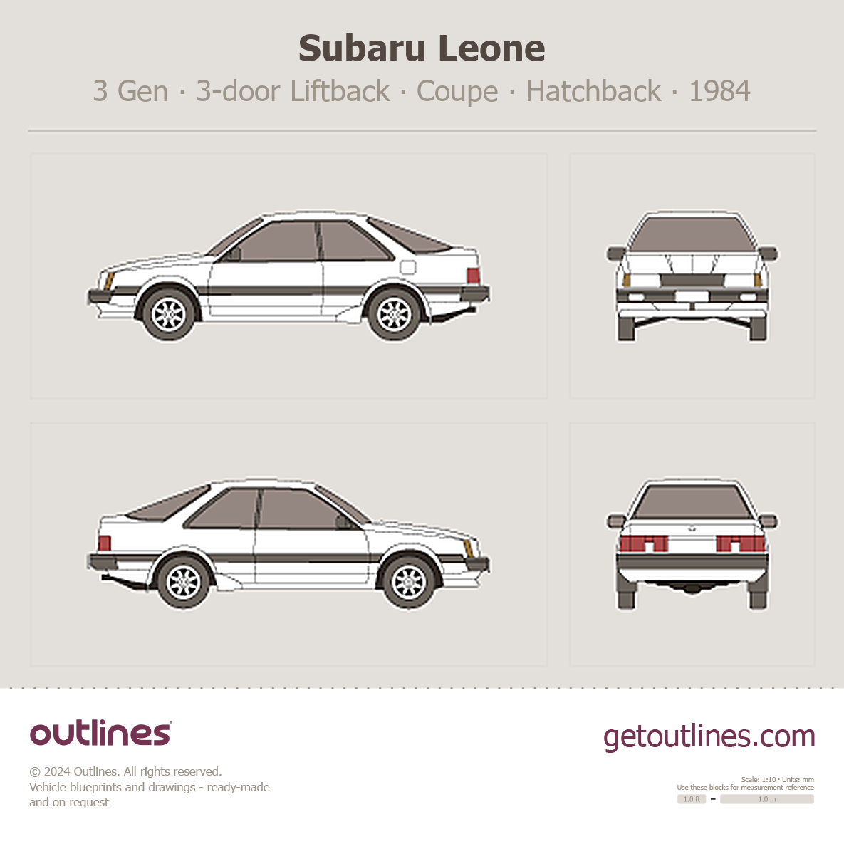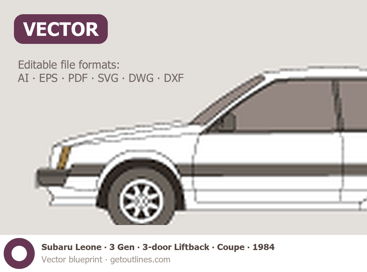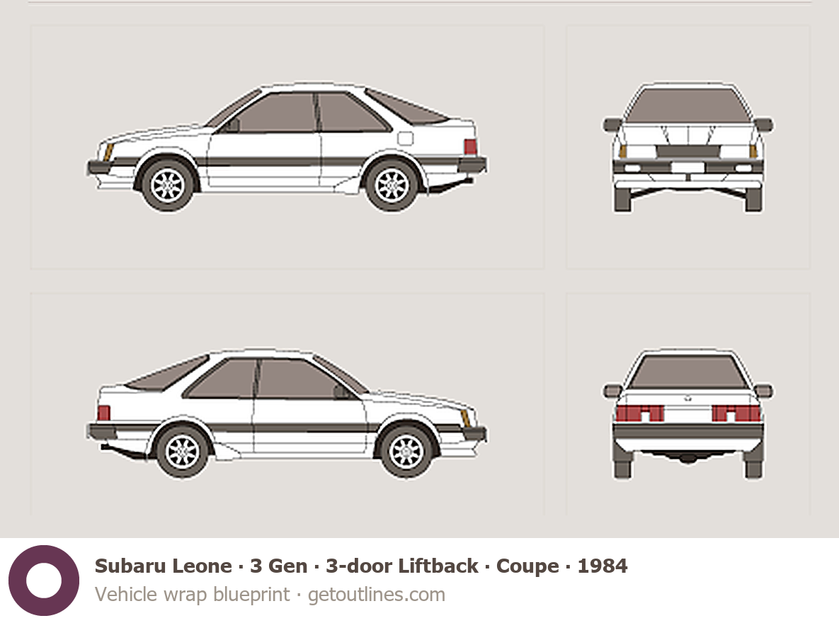 This 1984 Subaru Leone 3 Gen 3-door Liftback ∙ Coupe Hatchback blueprint helps designers, wrap studios, and 3D artists simplify their workflow and save valuable time for creative work instead of routine tasks.